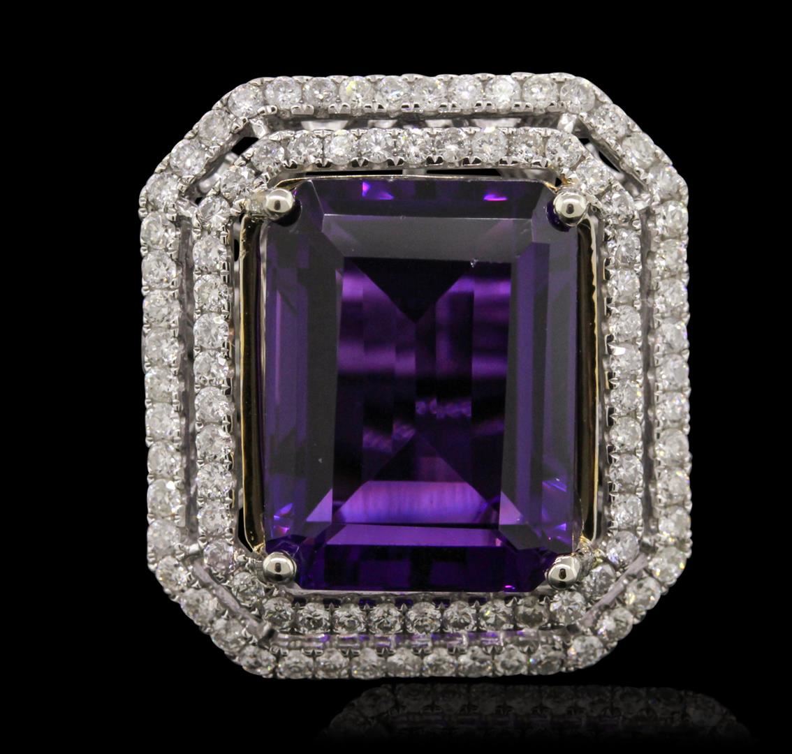 One electronically tested 14KT white and yellow gold Ladies combination cast & assembled ring with a bright polish finish. Condition is new. Identified with markings of "14K". Containing: One prong set emerald standard step cut natural amethyst, measuring 16.00 x 12.00 x 8.20mm, approximate weight of 11.31ct., clarity is eye clean, type II, medium dark, moderately strong, purple color, (GIA P 6/4), cut is good. Colored gemstones are presumed to have been subjected to commonly used color/clarity enhancement processes. Ninety-Two prong set round brilliant cut diamonds, measuring 1.50 - 1.30 x 0.84mm (depth est.) approximate. Total Weight of 92 Stones = 0.92ct. Clarity: I-1 to I-2. Color: I - J, Cut is Good. Total Weight of Colored Stones 11.31ct. Total Weight of Diamonds 0.92ct. Total Weight of Ring 12.20 grams. GGL Appraised at $8,755.00.
