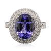 One electronically tested 14KT white and yellow gold Ladies combination cast & assembled ring with a bright polish finish. Condition is new. Identified with markings of "14K". Containing: One prong set triangle modified brilliant cut natural tanzanite, measuring 8.00 x 8.00 x 5.20mm, approximate weight of 2.01ct., clarity is eye clean, type I, medium, moderately strong, bluish violet color, (GIA bV 5/4), cut is good. Sixty prong set round brilliant cut diamonds, measuring 2.00 - 1.40 x 1.02mm (depth est.) approximate total weight of 60 Stones = 0.80ct. Clarity: SI-2 to I-1. Color: H - I, Cut is Good. Colored gemstones are presumed to have been subjected to commonly used enhancement processes. All diamonds and colored gemstones are graded in the mounting, unless otherwise stated. Total Weight of Colored Stones 2.01ct. Total Weight of Diamonds 0.80ct. Total Weight of Ring 7.40 grams. GGL Appraised at $7,085.00.