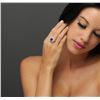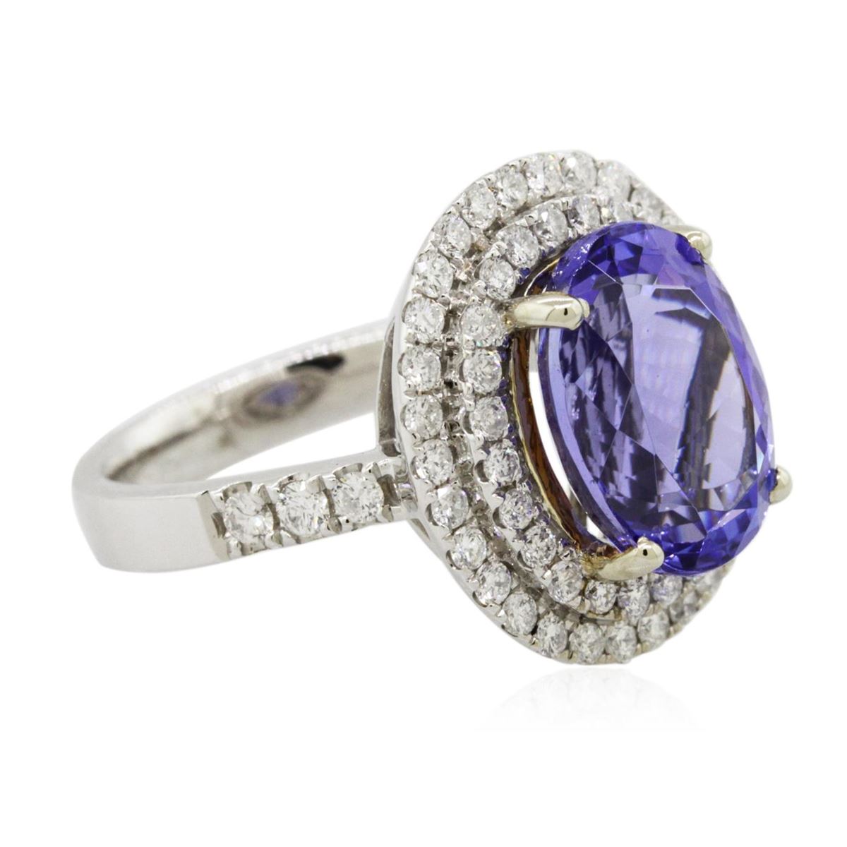 One electronically tested 14KT white and yellow gold Ladies combination cast & assembled ring with a bright polish finish. Condition is new. Identified with markings of "14K". Containing: One prong set triangle modified brilliant cut natural tanzanite, measuring 8.00 x 8.00 x 5.20mm, approximate weight of 2.01ct., clarity is eye clean, type I, medium, moderately strong, bluish violet color, (GIA bV 5/4), cut is good. Sixty prong set round brilliant cut diamonds, measuring 2.00 - 1.40 x 1.02mm (depth est.) approximate total weight of 60 Stones = 0.80ct. Clarity: SI-2 to I-1. Color: H - I, Cut is Good. Colored gemstones are presumed to have been subjected to commonly used enhancement processes. All diamonds and colored gemstones are graded in the mounting, unless otherwise stated. Total Weight of Colored Stones 2.01ct. Total Weight of Diamonds 0.80ct. Total Weight of Ring 7.40 grams. GGL Appraised at $7,085.00.