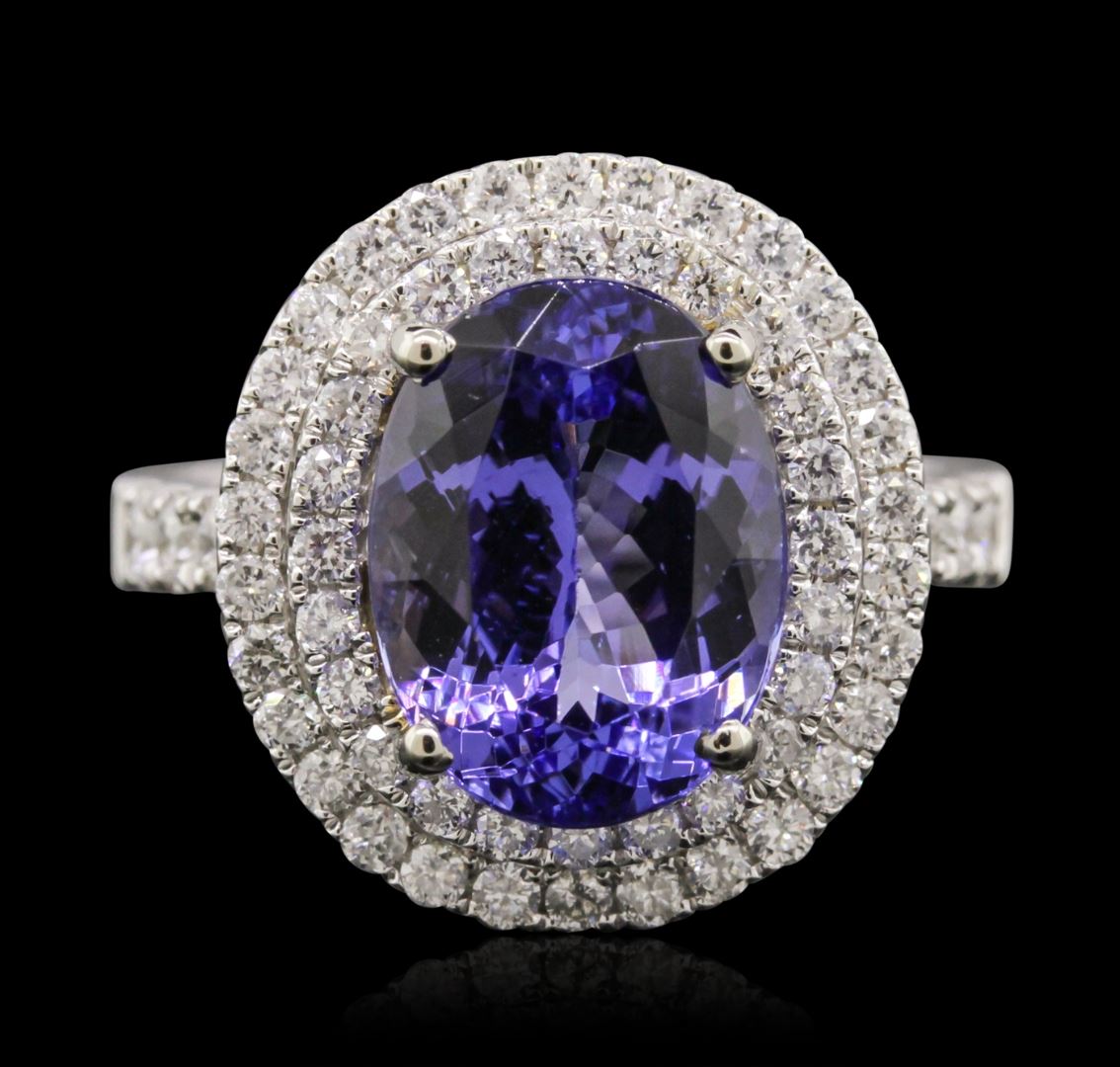 One electronically tested 14KT white and yellow gold Ladies combination cast & assembled ring with a bright polish finish. Condition is new. Identified with markings of "14K". Containing: One prong set triangle modified brilliant cut natural tanzanite, measuring 8.00 x 8.00 x 5.20mm, approximate weight of 2.01ct., clarity is eye clean, type I, medium, moderately strong, bluish violet color, (GIA bV 5/4), cut is good. Sixty prong set round brilliant cut diamonds, measuring 2.00 - 1.40 x 1.02mm (depth est.) approximate total weight of 60 Stones = 0.80ct. Clarity: SI-2 to I-1. Color: H - I, Cut is Good. Colored gemstones are presumed to have been subjected to commonly used enhancement processes. All diamonds and colored gemstones are graded in the mounting, unless otherwise stated. Total Weight of Colored Stones 2.01ct. Total Weight of Diamonds 0.80ct. Total Weight of Ring 7.40 grams. GGL Appraised at $7,085.00.