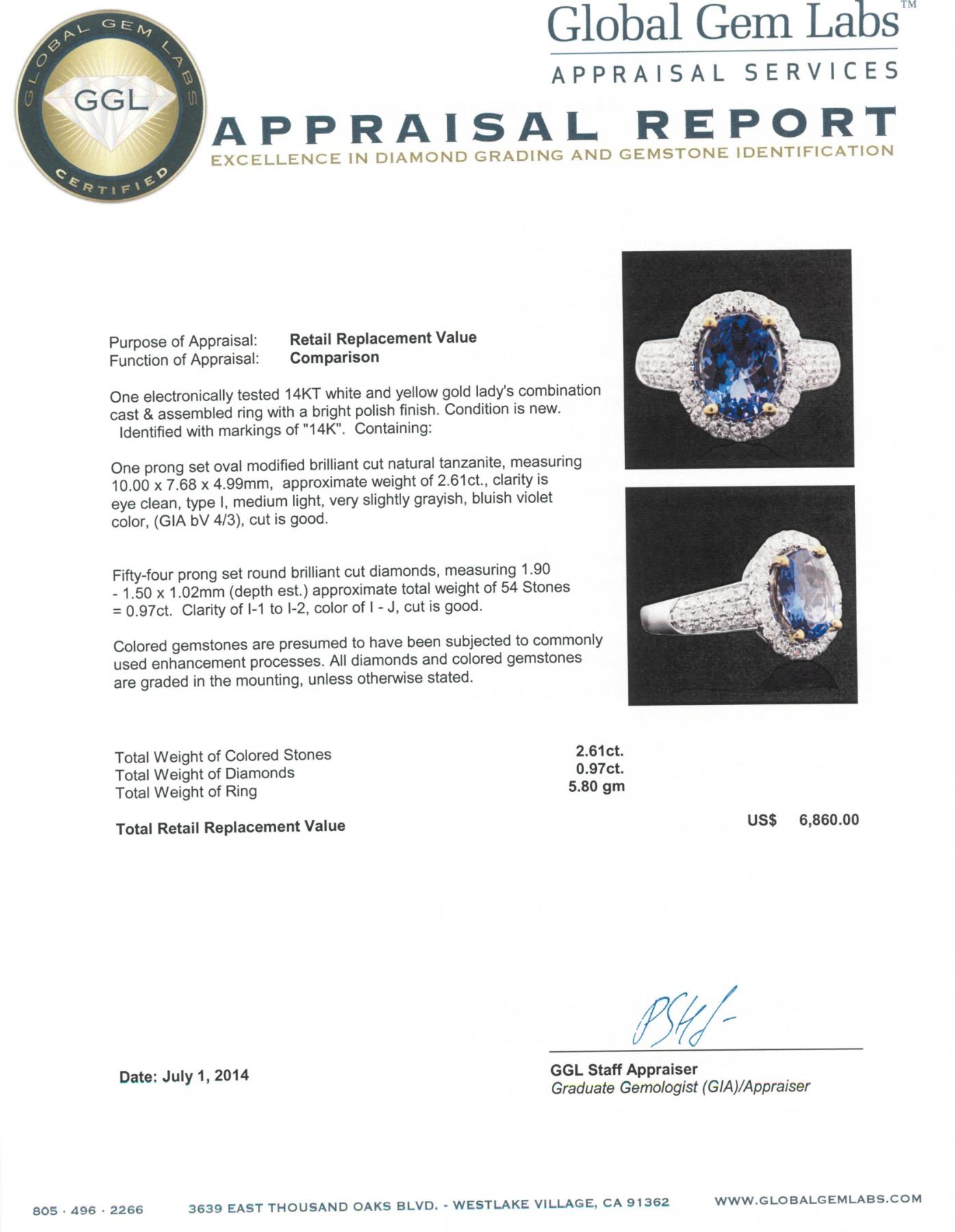 One electronically tested 14KT white and yellow gold Ladies combination cast & assembled ring with a bright polish finish. Condition is new. Identified with markings of "14K". Containing: One prong set oval modified brilliant cut natural tanzanite, measuring 10.00 x 7.68 x 4.99mm, approximate weight of 2.61ct., clarity is eye clean, type I, medium light, very slightly grayish, bluish violet color, (GIA bV 4/3), cut is good. Fifty-Four prong set round brilliant cut diamonds, measuring 1.90 - 1.50 x 1.02mm (depth est.) approximate total weight of 54 Stones = 0.97ct. Clarity: I-1 to I-2. Color: I - J, Cut is Good. Colored gemstones are presumed to have been subjected to commonly used enhancement processes. All diamonds and colored gemstones are graded in the mounting, unless otherwise stated. Total Weight of Colored Stones 2.61ct. Total Weight of Diamonds 0.97ct. Total Weight of Ring 5.80 grams. GGL Appraised.