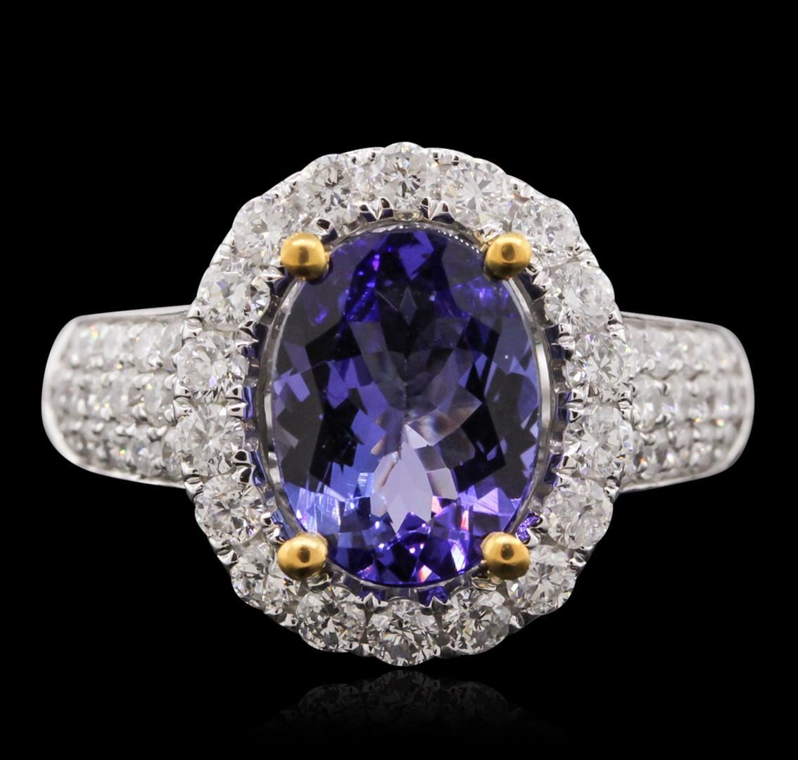 One electronically tested 14KT white and yellow gold Ladies combination cast & assembled ring with a bright polish finish. Condition is new. Identified with markings of "14K". Containing: One prong set oval modified brilliant cut natural tanzanite, measuring 10.00 x 7.68 x 4.99mm, approximate weight of 2.61ct., clarity is eye clean, type I, medium light, very slightly grayish, bluish violet color, (GIA bV 4/3), cut is good. Fifty-Four prong set round brilliant cut diamonds, measuring 1.90 - 1.50 x 1.02mm (depth est.) approximate total weight of 54 Stones = 0.97ct. Clarity: I-1 to I-2. Color: I - J, Cut is Good. Colored gemstones are presumed to have been subjected to commonly used enhancement processes. All diamonds and colored gemstones are graded in the mounting, unless otherwise stated. Total Weight of Colored Stones 2.61ct. Total Weight of Diamonds 0.97ct. Total Weight of Ring 5.80 grams. GGL Appraised.
