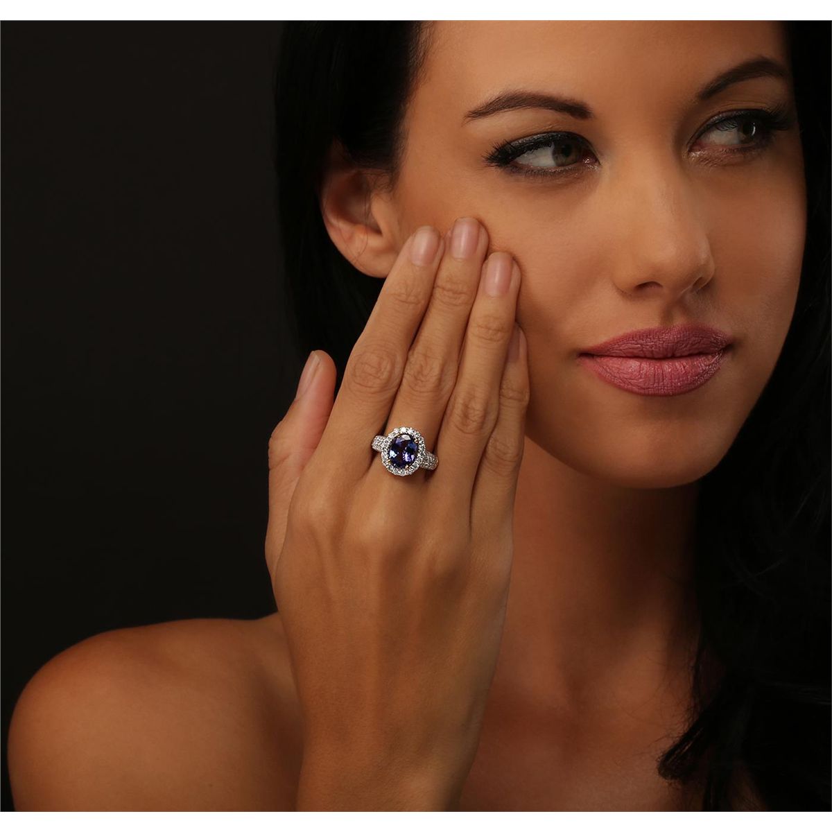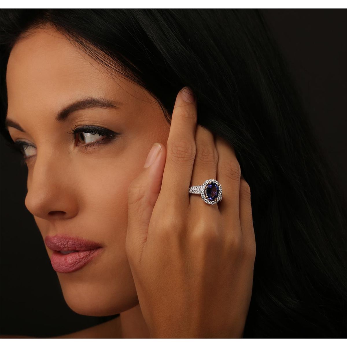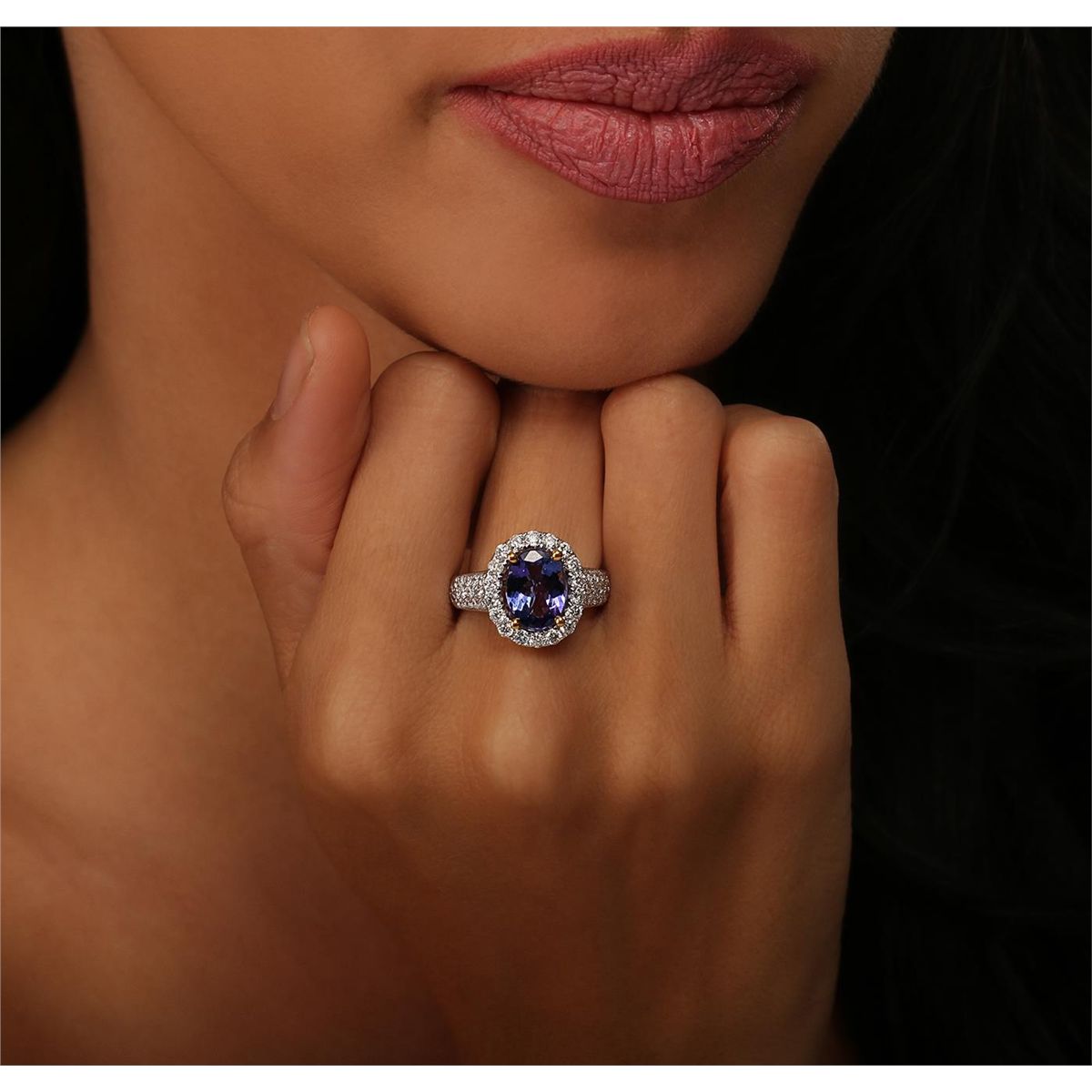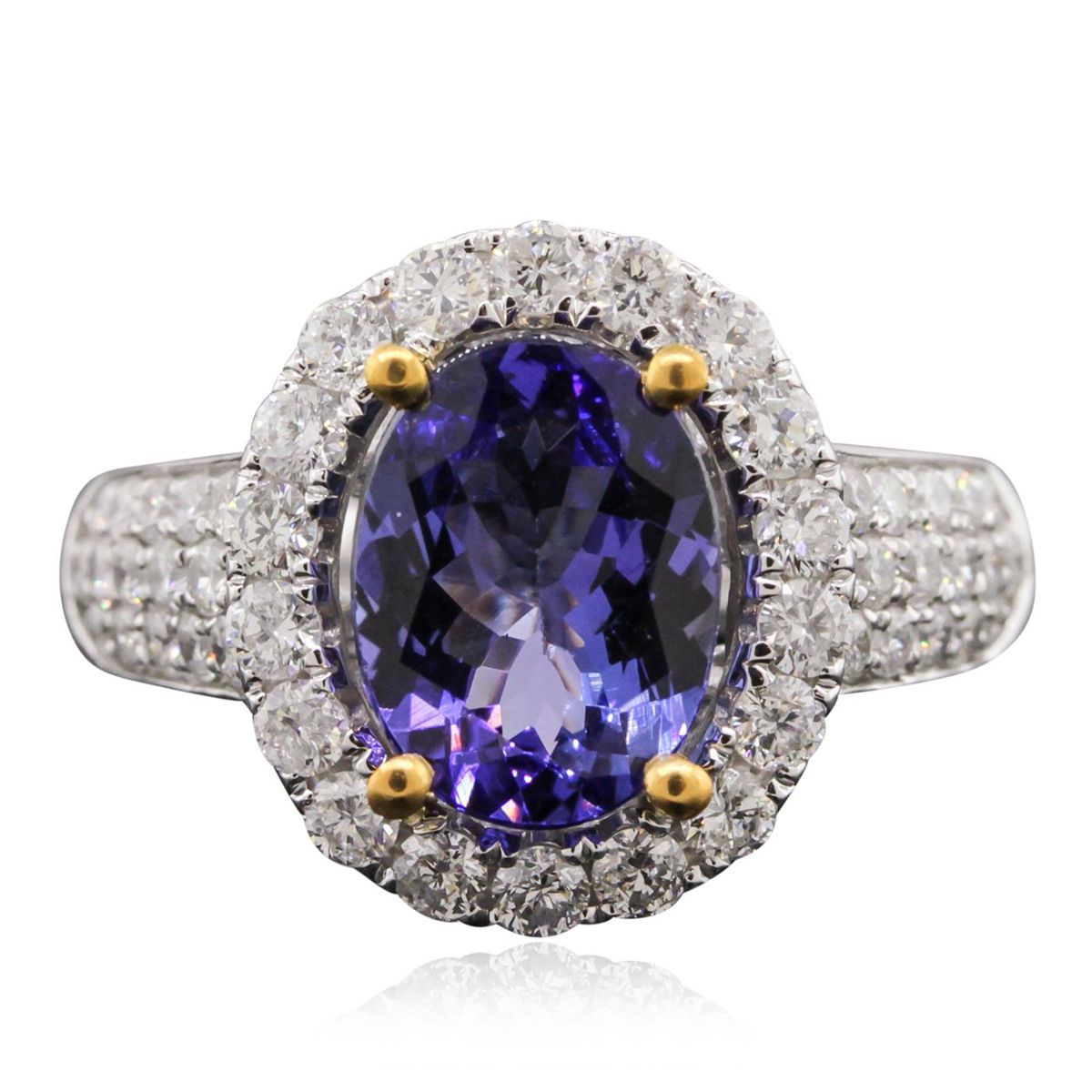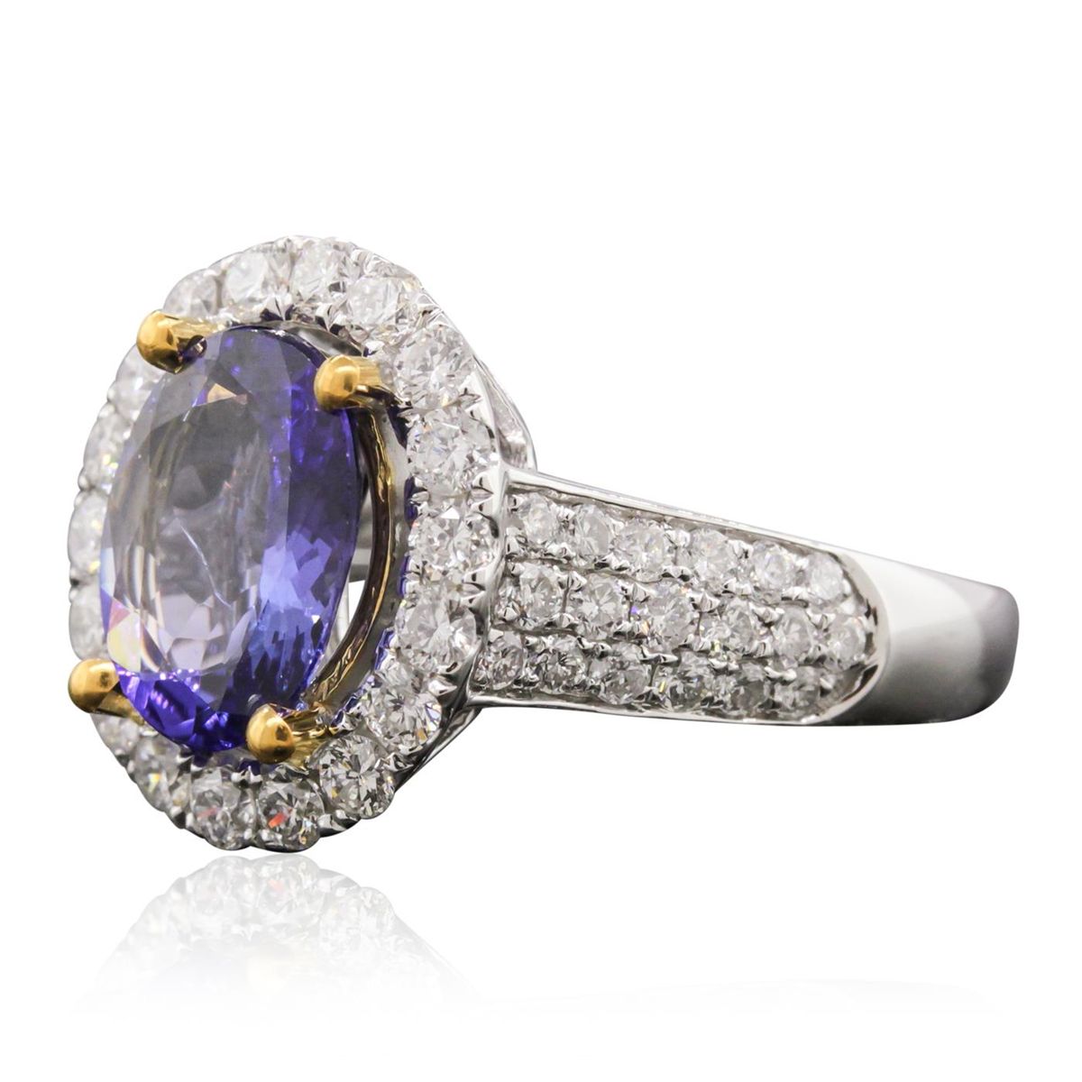 One electronically tested 14KT white and yellow gold Ladies combination cast & assembled ring with a bright polish finish. Condition is new. Identified with markings of "14K". Containing: One prong set oval modified brilliant cut natural tanzanite, measuring 10.00 x 7.68 x 4.99mm, approximate weight of 2.61ct., clarity is eye clean, type I, medium light, very slightly grayish, bluish violet color, (GIA bV 4/3), cut is good. Fifty-Four prong set round brilliant cut diamonds, measuring 1.90 - 1.50 x 1.02mm (depth est.) approximate total weight of 54 Stones = 0.97ct. Clarity: I-1 to I-2. Color: I - J, Cut is Good. Colored gemstones are presumed to have been subjected to commonly used enhancement processes. All diamonds and colored gemstones are graded in the mounting, unless otherwise stated. Total Weight of Colored Stones 2.61ct. Total Weight of Diamonds 0.97ct. Total Weight of Ring 5.80 grams. GGL Appraised at $6,860.00.
