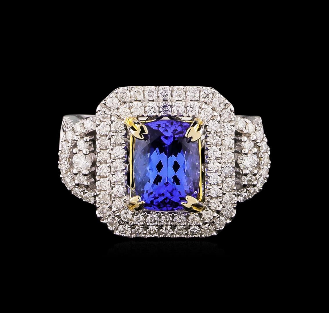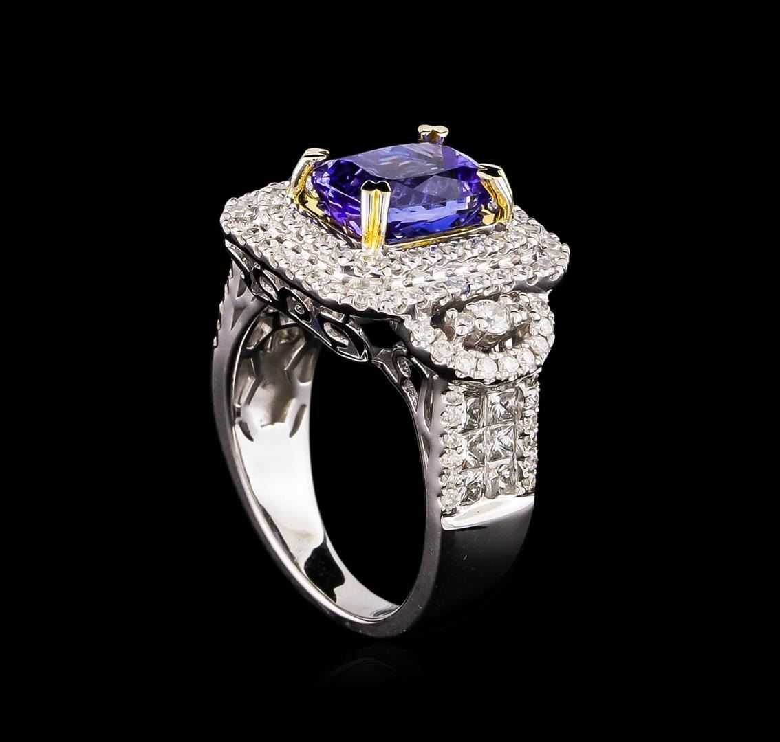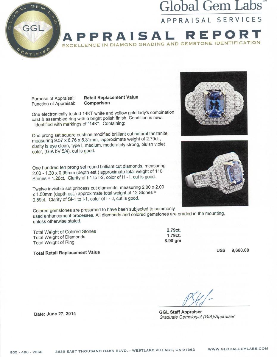 One electronically tested 14KT white and yellow gold Ladies combination cast & assembled ring with a bright polish finish. Condition is new. Identified with markings of "14K". Containing: One prong set square cushion modified brilliant cut natural tanzanite, measuring 9.57 x 6.76 x 5.31mm, approximate weight of 2.79ct., clarity is eye clean, type I, medium, moderately strong, bluish violet color, (GIA bV 5/4), cut is good. One Hundred Ten prong set round brilliant cut diamonds, measuring 2.00 - 1.30 x 0.99mm (depth est.) approximate total weight of 110 Stones = 1.20ct. Clarity: I-1 to I-2. Color: H - I, Cut is Good. Twelve invisible set princess cut diamonds, measuring 2.00 x 2.00 x 1.50mm (depth est.) approximate total weight of 12 Stones = 0.59ct. Clarity: SI-1 to I-1. Color: I - J, Cut is Good. Colored gemstones are presumed to have been subjected to commonly used enhancement processes. All diamonds and colored gemstones are graded in the mounting, unless otherwise stated. Total Weight of Colored Stones 2.79ct. Total Weight of Diamonds 1.79ct. Total Weight of Ring 8.90 grams. GGL Appraised at $9,660.00.