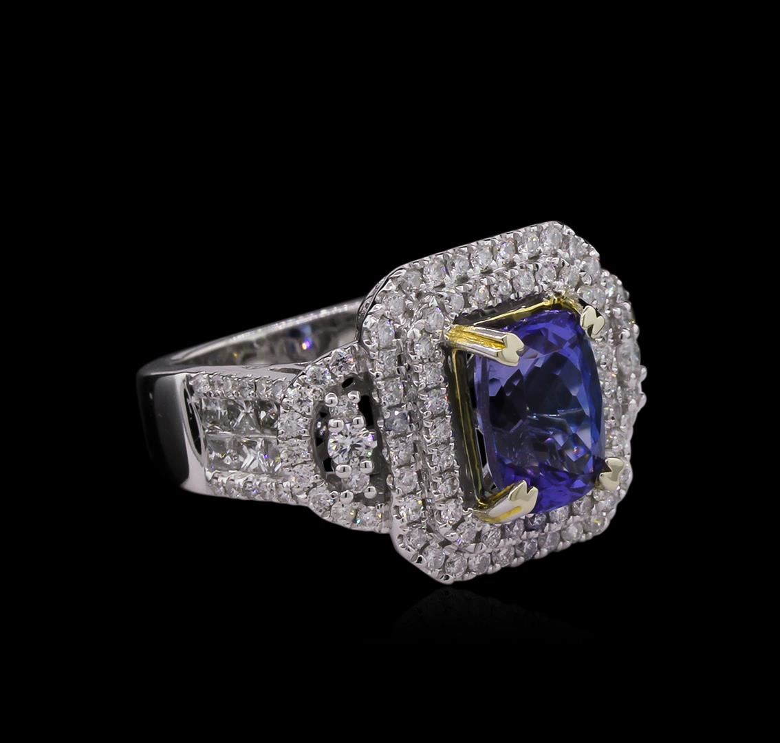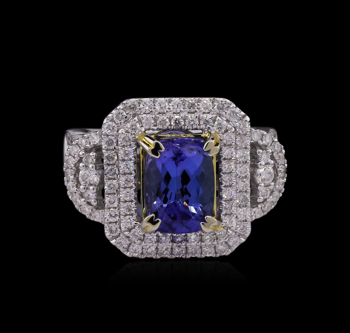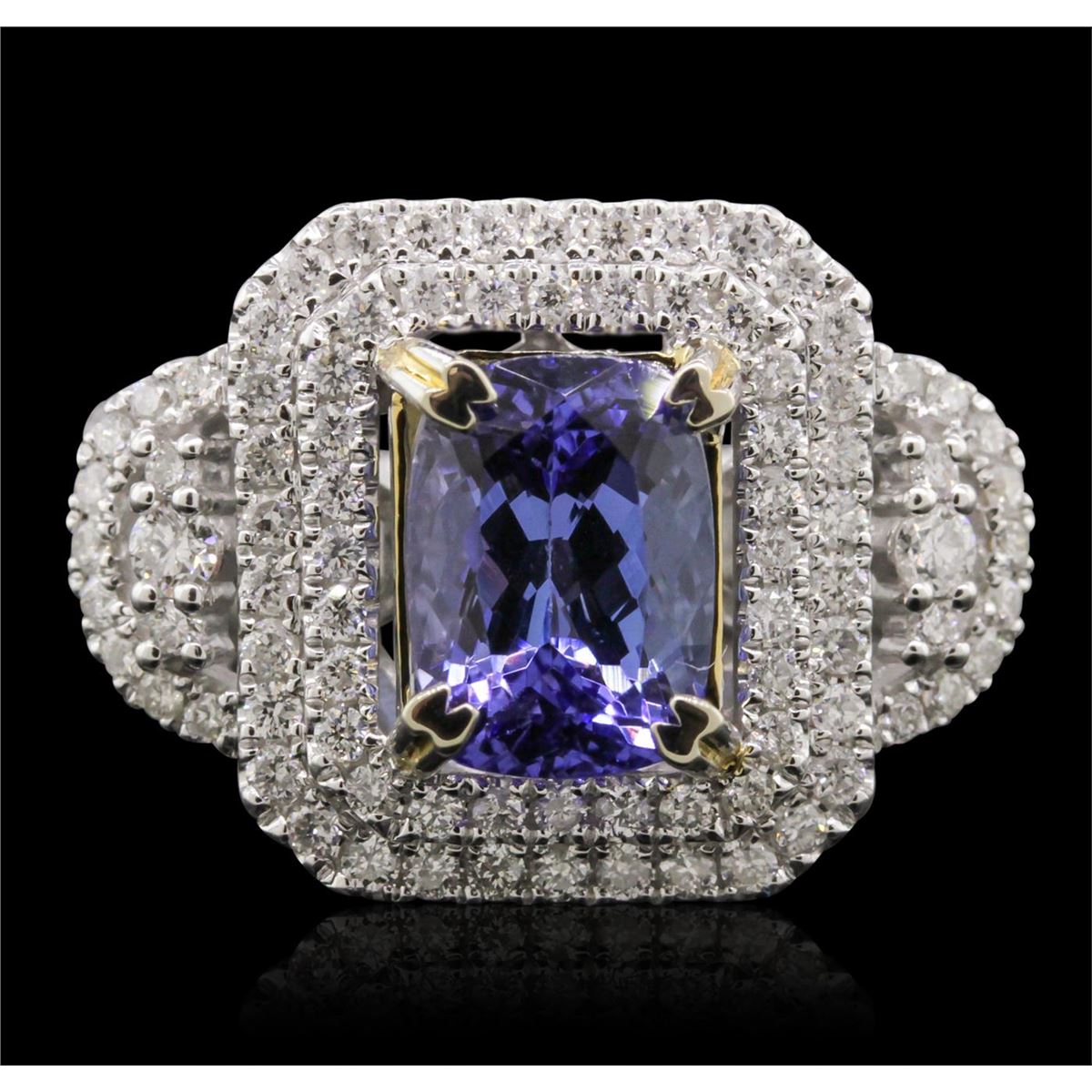 One electronically tested 14KT white and yellow gold Ladies combination cast & assembled ring with a bright polish finish. Condition is new. Identified with markings of "14K". Containing: One prong set square cushion modified brilliant cut natural tanzanite, measuring 9.57 x 6.76 x 5.31mm, approximate weight of 2.79ct., clarity is eye clean, type I, medium, moderately strong, bluish violet color, (GIA bV 5/4), cut is good. One Hundred Ten prong set round brilliant cut diamonds, measuring 2.00 - 1.30 x 0.99mm (depth est.) approximate total weight of 110 Stones = 1.20ct. Clarity: I-1 to I-2. Color: H - I, Cut is Good. Twelve invisible set princess cut diamonds, measuring 2.00 x 2.00 x 1.50mm (depth est.) approximate total weight of 12 Stones = 0.59ct. Clarity: SI-1 to I-1. Color: I - J, Cut is Good. Colored gemstones are presumed to have been subjected to commonly used enhancement processes. All diamonds and colored gemstones are graded in the mounting, unless otherwise stated. Total Weight of Colored Stones 2.79ct. Total Weight of Diamonds 1.79ct. Total Weight of Ring 8.90 grams. GGL Appraised at $9,660.00.