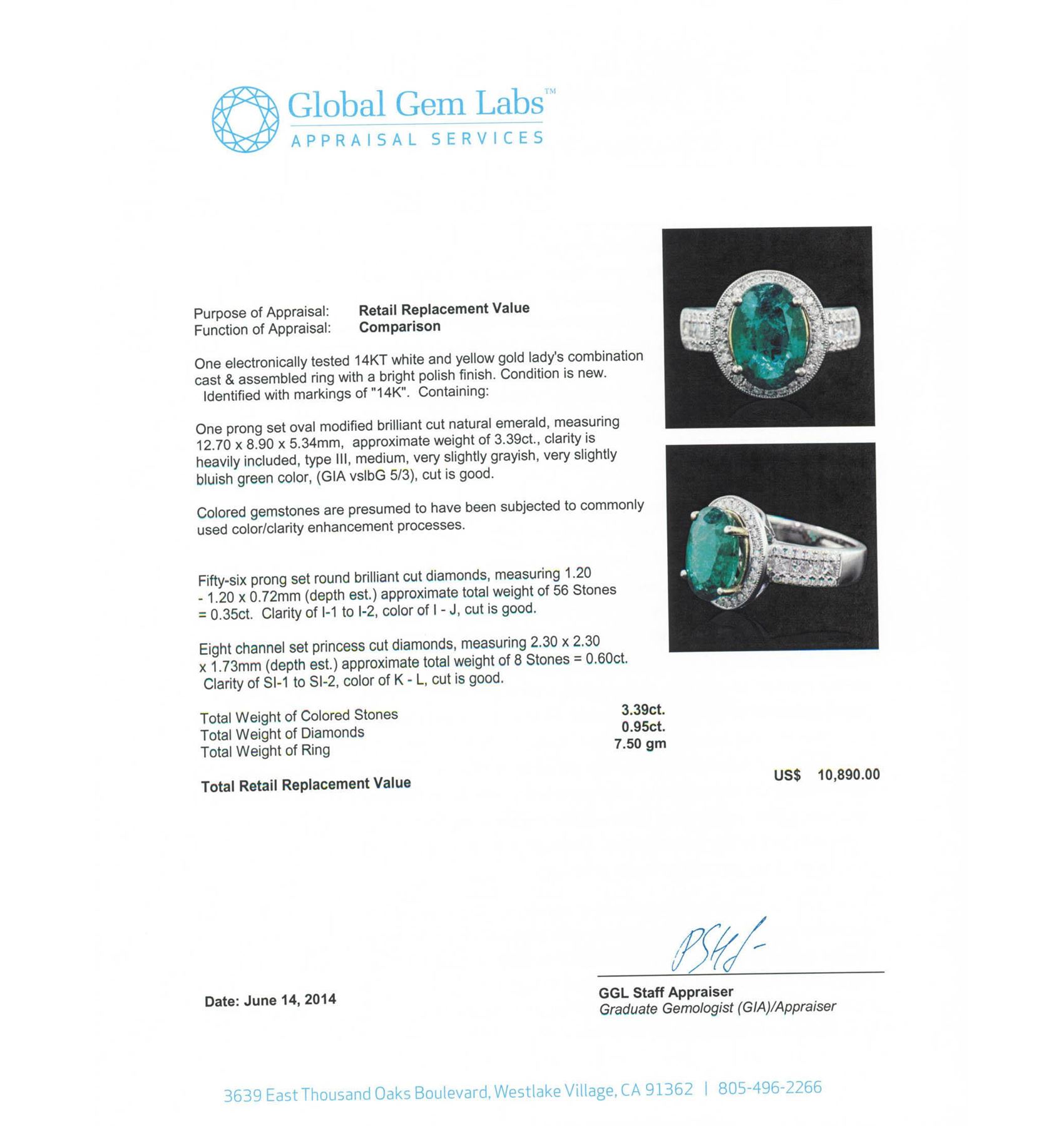 One electronically tested 14KT white and yellow gold Ladies combination cast & assembled ring with a bright polish finish. Condition is new. Identified with markings of "14K". Containing: One prong set oval modified brilliant cut natural emerald, measuring 12.70 x 8.90 x 5.34mm, approximate weight of 3.39ct., clarity is heavily included, type III, medium, very slightly grayish, very slightly bluish green color, (GIA vslbG 5/3), cut is good. Colored gemstones are presumed to have been subjected to commonly used color/clarity enhancement processes. Fifty-Six prong set round brilliant cut diamonds, measuring 1.20 - 1.20 x 0.72mm (depth est.) approximate. Total Weight of 56 Stones = 0.35ct. Clarity: I-1 to I-2. Color: I - J, Cut is Good. Eight channel set princess cut diamonds, measuring 2.30 x 2.30 x 1.73mm (depth est.) approximate. Total Weight of 8 Stones = 0.60ct. Clarity: SI-1 to SI-2. Color: K - L, Cut is Good. Total Weight of Colored Stones 3.39ct. Total Weight of Diamonds 0.95ct. Total Weight of Ring 7.50 grams. GGL Appraised at $10,890.00.