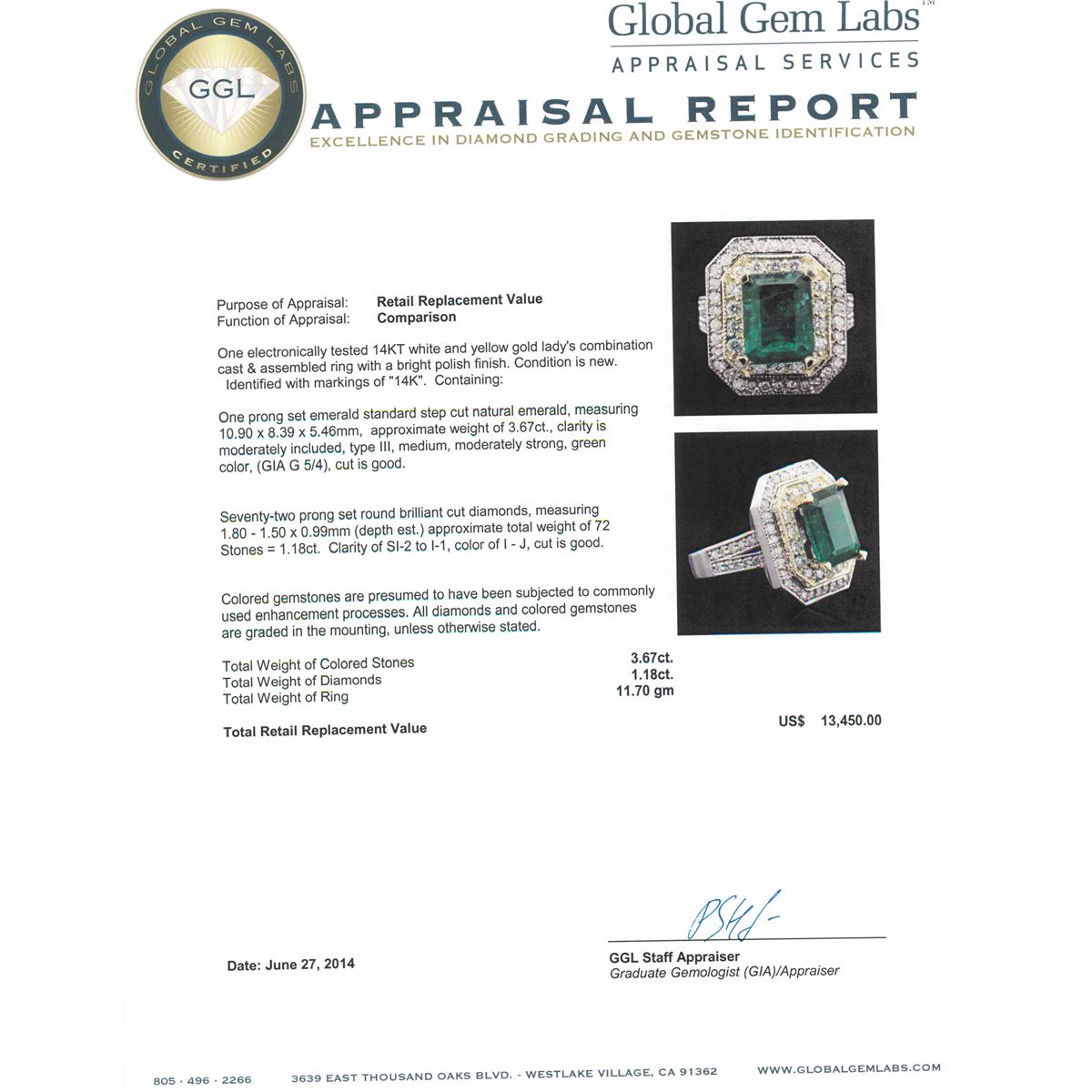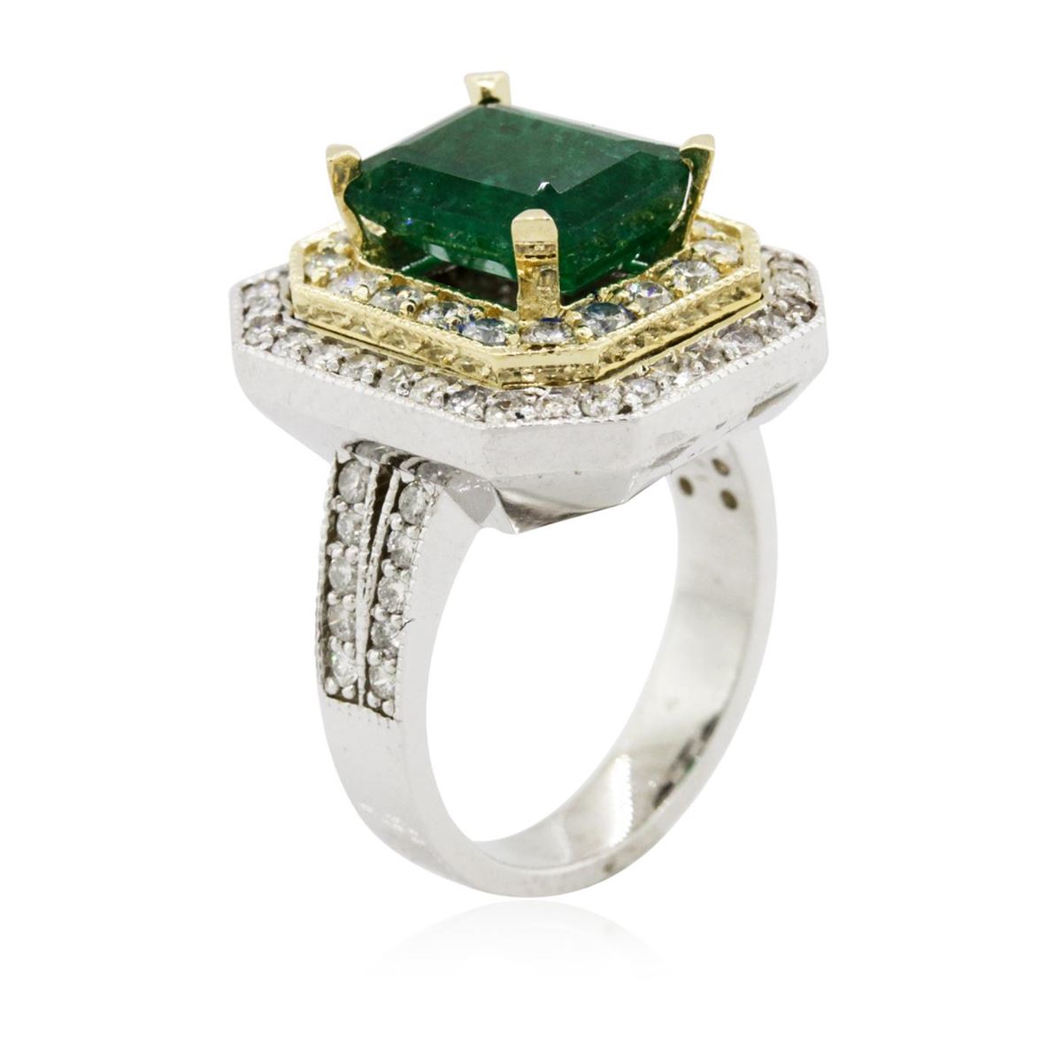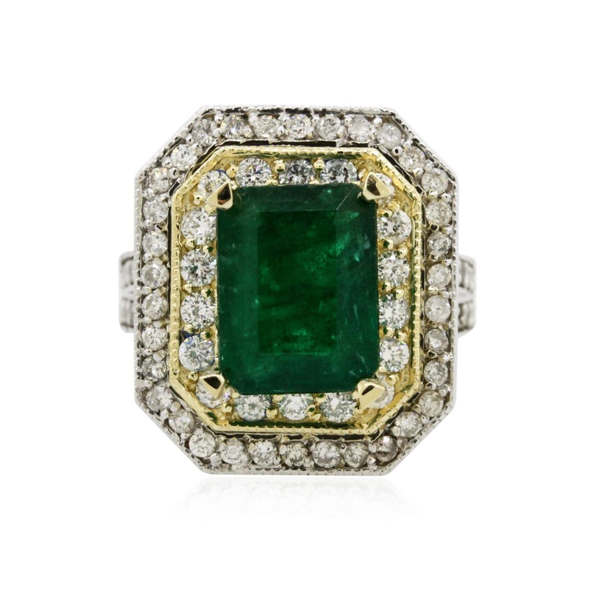 One electronically tested 14KT white and yellow gold Ladies combination cast & assembled ring with a bright polish finish. Condition is new. Identified with markings of "14K". Containing: One prong set emerald standard step cut natural emerald, measuring 10.90 x 8.39 x 5.46mm, approximate weight of 3.67ct., clarity is moderately included, type III, medium, moderately strong, green color, (GIA G 5/4), cut is good. Seventy-Two prong set round brilliant cut diamonds, measuring 1.80 - 1.50 x 0.99mm (depth est.) approximate total weight of 72 Stones = 1.18ct. Clarity: SI-2 to I-1. Color: I - J, Cut is Good. Colored gemstones are presumed to have been subjected to commonly used enhancement processes. All diamonds and colored gemstones are graded in the mounting, unless otherwise stated. Total Weight of Colored Stones 3.67ct. Total Weight of Diamonds 1.18ct. Total Weight of Ring 11.70 grams. GGL Appraised at $13,450.00.