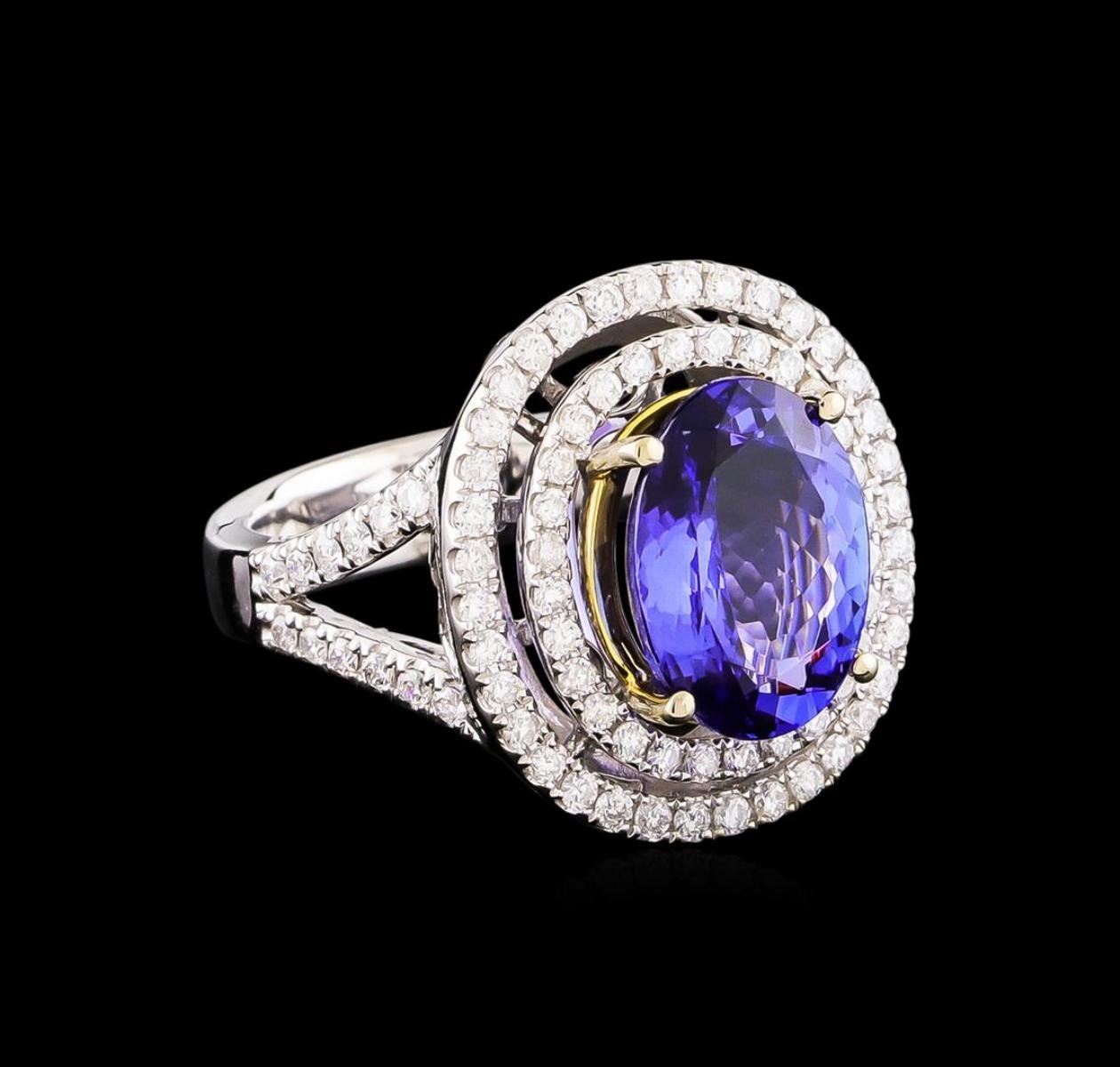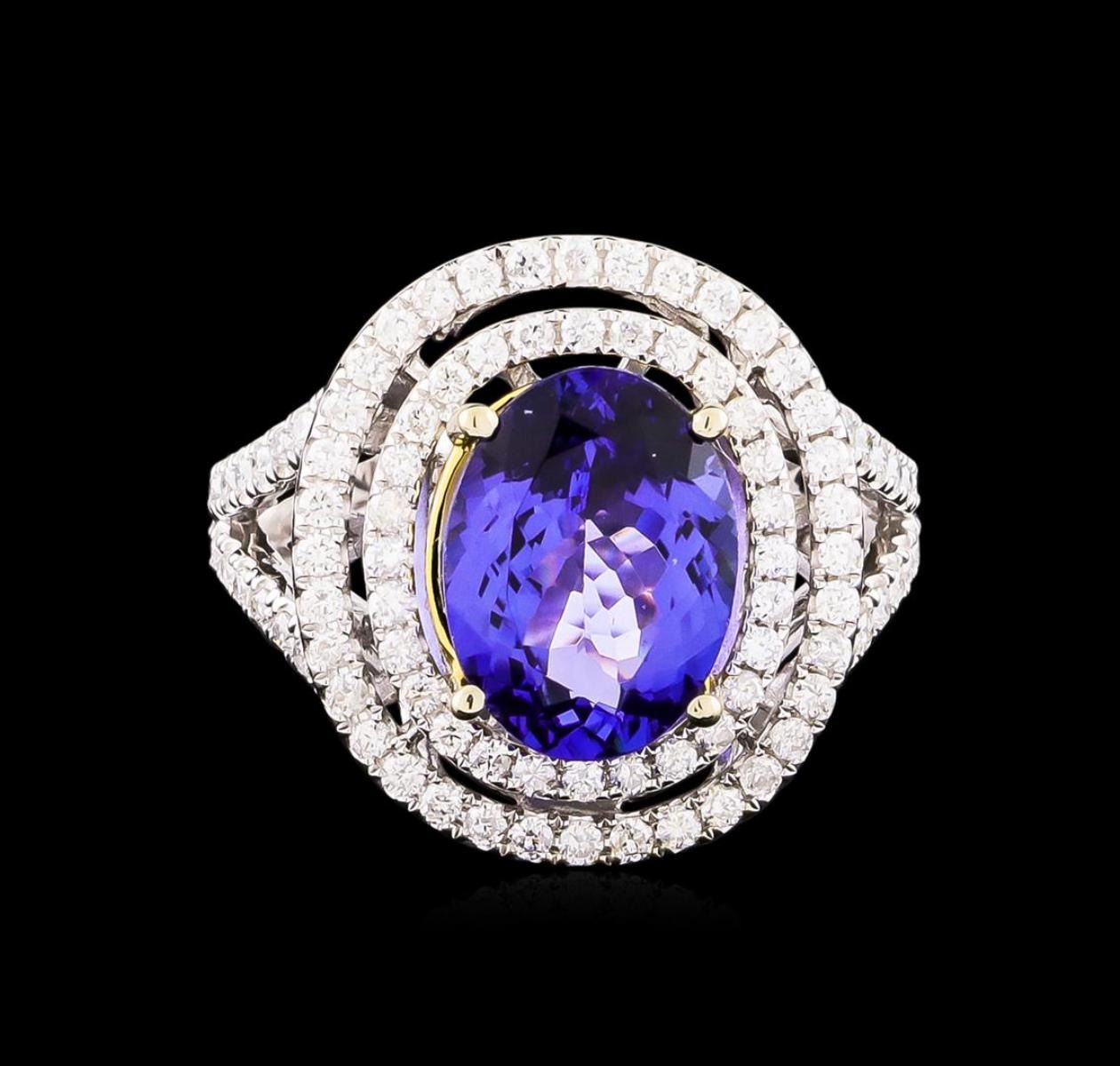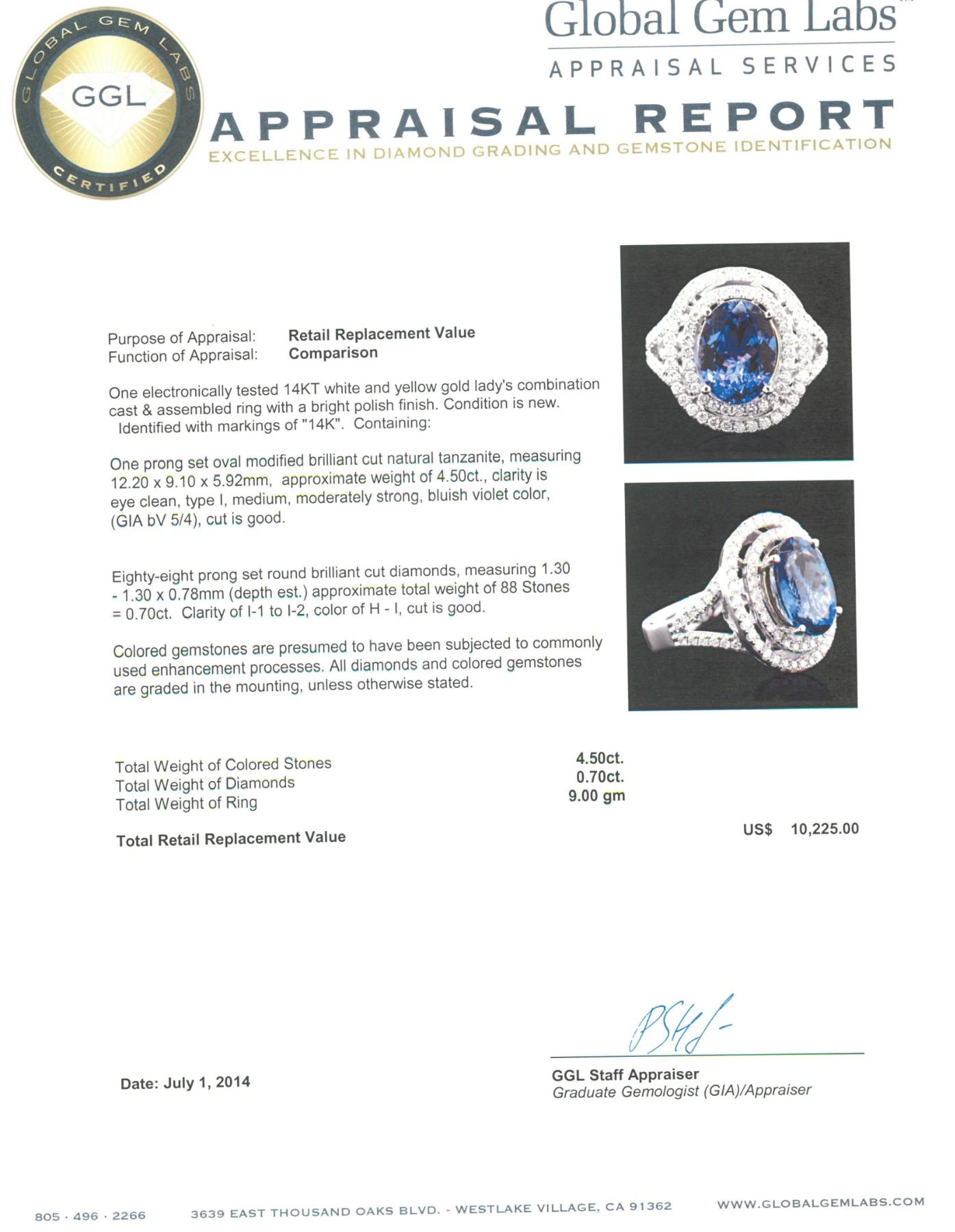One electronically tested 14KT white and yellow gold Ladies combination cast & assembled ring with a bright polish finish. Condition is new. Identified with markings of "14K". Containing: One prong set oval modified brilliant cut natural tanzanite, measuring 12.20 x 9.10 x 5.92mm, approximate weight of 4.50 ct., clarity is eye clean, type I, medium, moderately strong, bluish violet color, (GIA bV 5/4), cut is good. Eighty-Eight prong set round brilliant cut diamonds, measuring 1.30 - 1.30 x 0.78mm (depth est.) approximate total weight of 88 Stones = 0.70 ct. Clarity: I-1 to I-2. Color: H - I, Cut is Good. Colored gemstones are presumed to have been subjected to commonly used enhancement processes. All diamonds and colored gemstones are graded in the mounting, unless otherwise stated. Total Weight of Colored Stones 4.50 ct. Total Weight of Diamonds 0.70 ct. Total Weight of Ring 9.00 grams. GGL Appraised.