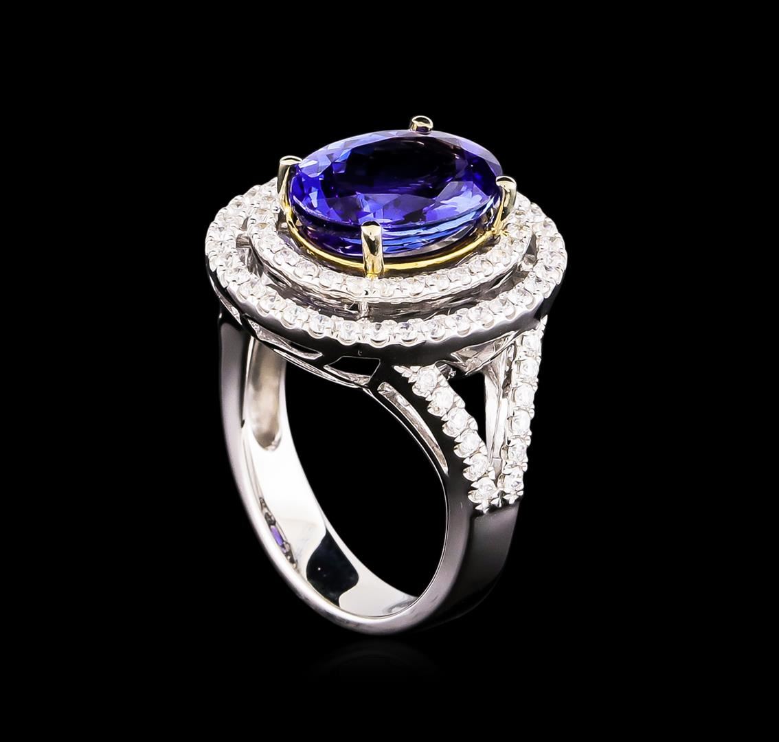 One electronically tested 14KT white and yellow gold Ladies combination cast & assembled ring with a bright polish finish. Condition is new. Identified with markings of "14K". Containing: One prong set oval modified brilliant cut natural tanzanite, measuring 12.20 x 9.10 x 5.92mm, approximate weight of 4.50 ct., clarity is eye clean, type I, medium, moderately strong, bluish violet color, (GIA bV 5/4), cut is good. Eighty-Eight prong set round brilliant cut diamonds, measuring 1.30 - 1.30 x 0.78mm (depth est.) approximate total weight of 88 Stones = 0.70 ct. Clarity: I-1 to I-2. Color: H - I, Cut is Good. Colored gemstones are presumed to have been subjected to commonly used enhancement processes. All diamonds and colored gemstones are graded in the mounting, unless otherwise stated. Total Weight of Colored Stones 4.50 ct. Total Weight of Diamonds 0.70 ct. Total Weight of Ring 9.00 grams. GGL Appraised.