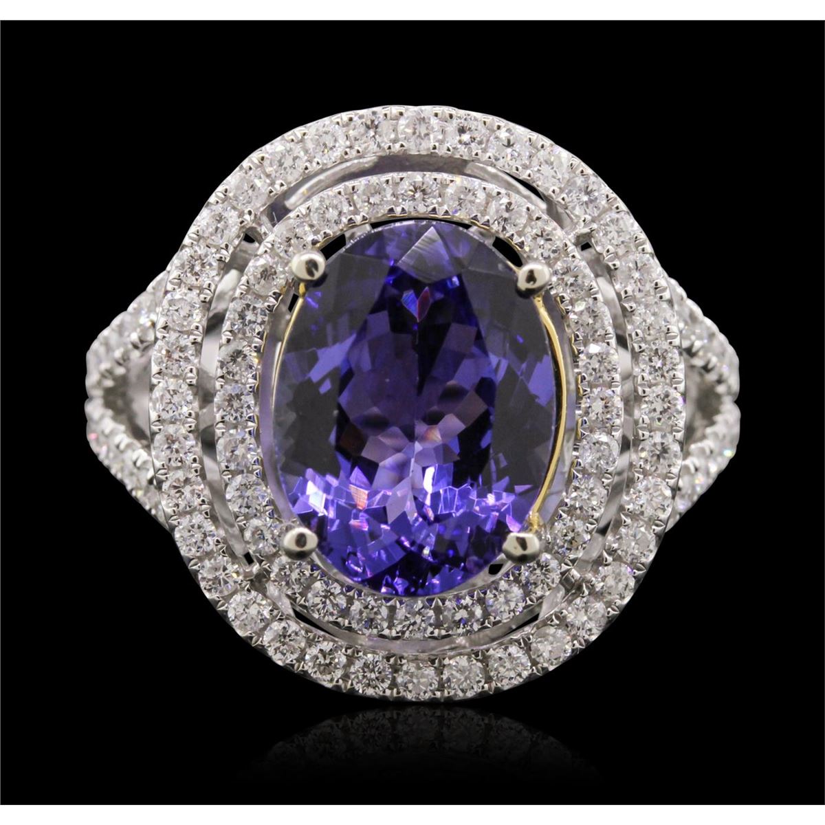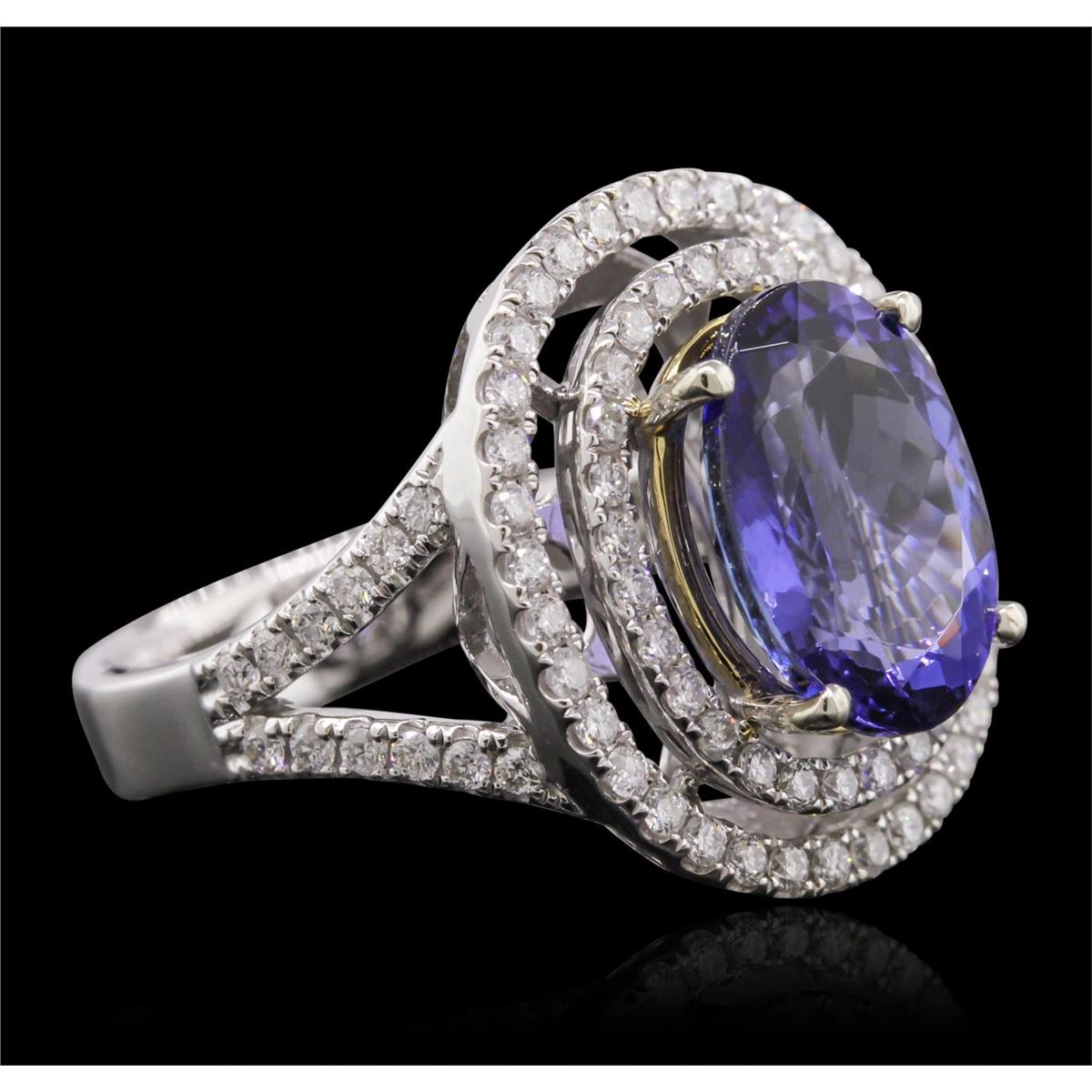 One electronically tested 14KT white and yellow gold Ladies combination cast & assembled ring with a bright polish finish. Condition is new. Identified with markings of "14K". Containing: One prong set oval modified brilliant cut natural tanzanite, measuring 12.20 x 9.10 x 5.92mm, approximate weight of 4.50ct., clarity is eye clean, type I, medium, moderately strong, bluish violet color, (GIA bV 5/4), cut is good. Eighty-Eight prong set round brilliant cut diamonds, measuring 1.30 - 1.30 x 0.78mm (depth est.) approximate total weight of 88 Stones = 0.70ct. Clarity: I-1 to I-2. Color: H - I, Cut is Good. Colored gemstones are presumed to have been subjected to commonly used enhancement processes. All diamonds and colored gemstones are graded in the mounting, unless otherwise stated. Total Weight of Colored Stones 4.50ct. Total Weight of Diamonds 0.70ct. Total Weight of Ring 9.00 grams. GGL Appraised at $10,225.00.