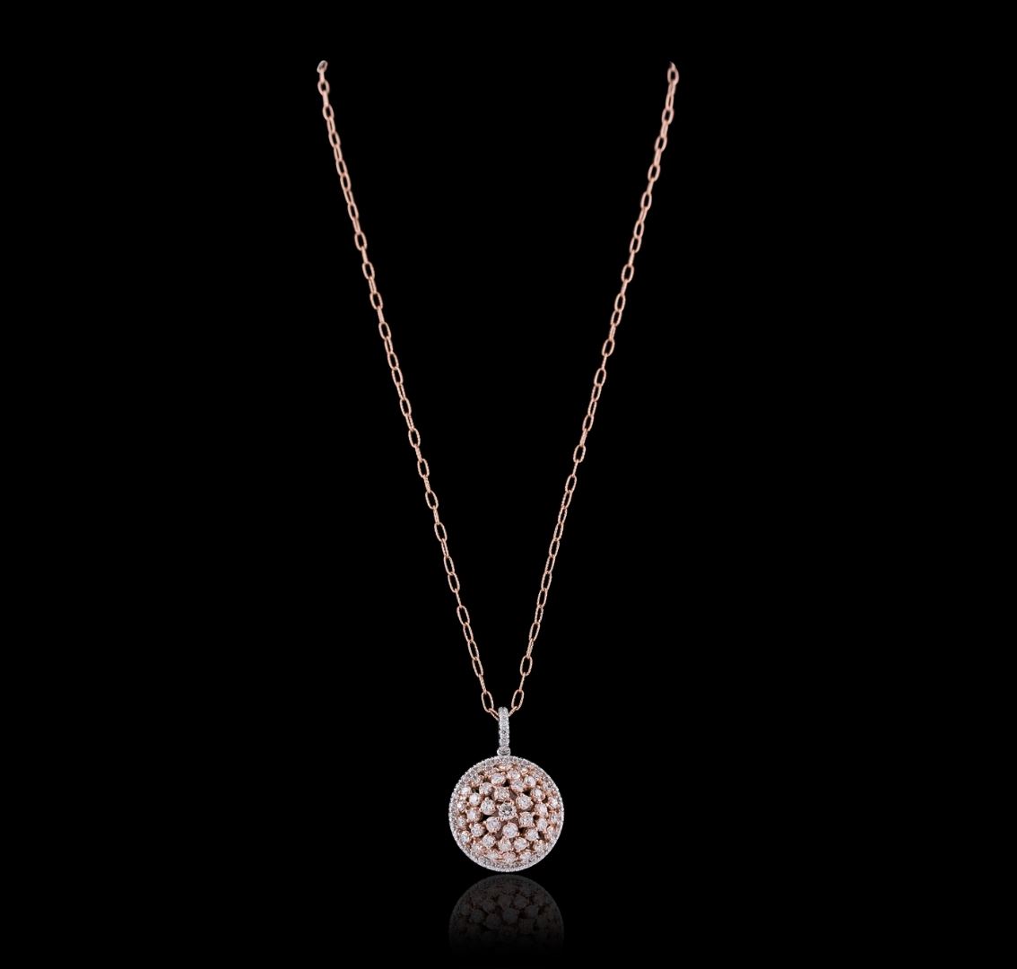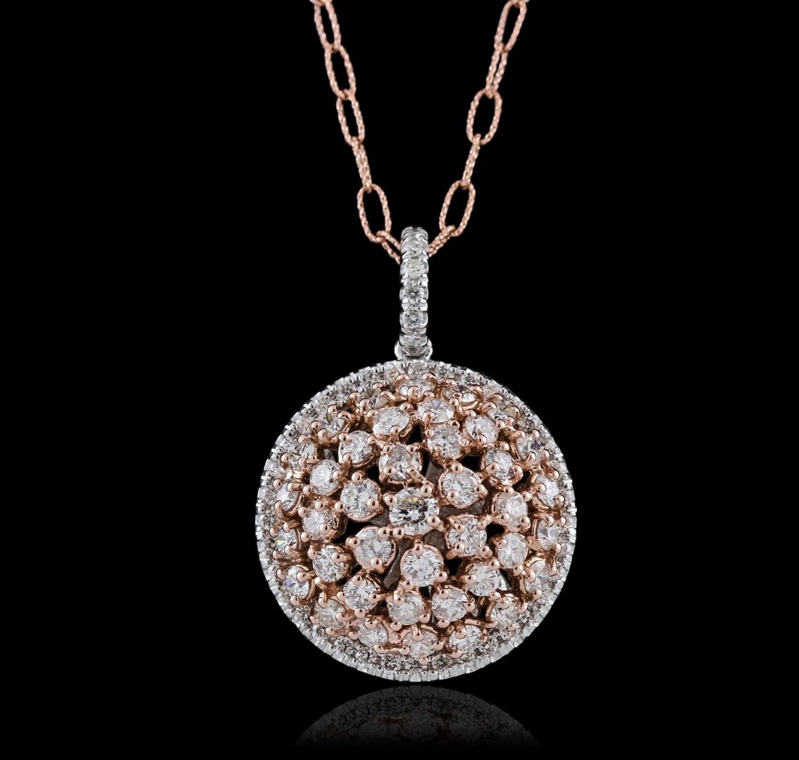 One electronically tested 14KT rose and white gold ladies cast & assembled diamond pendant with chain. The pendant features a rose gold diamond cluster set within a white gold diamond bezel, completed by a white gold diamond set bail. The pendant is supported by an eighteen inch length 14KT rose gold designer style link chain, terminating in a lobster claw clasp. Bright polish finish. Identified with markings of "K14". Condition is new, good workmanship. Containing: Forty prong set round brilliant cut diamonds, measuring 3.20 - 2.80 x 1.80mm (depth est.) approximate total weight of 40 Stones = 4.05ct. Graded in the setting. Clarity: SI-1 to I-1 . Color: G - I Forty-Four prong set round brilliant cut diamonds, measuring 1.60 - 1.50 x 0.93mm (depth est.) approximate total weight of 44 Stones = 0.69ct. Graded in the setting. Clarity: SI-1 to I-1 . Color: G - I. Total Weight of Diamonds 4.74ct. Total Weight of Pendant With Chain 14.38 grams. AIG Appraised at $16,225.00.