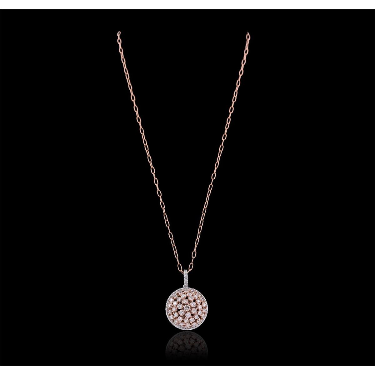 One electronically tested 14KT rose and white gold ladies cast & assembled diamond pendant with chain. The pendant features a rose gold diamond cluster set within a white gold diamond bezel, completed by a white gold diamond set bail. The pendant is supported by an eighteen inch length 14KT rose gold designer style link chain, terminating in a lobster claw clasp. Bright polish finish. Identified with markings of "K14". Condition is new, good workmanship. Containing: Forty prong set round brilliant cut diamonds, measuring 3.20 - 2.80 x 1.80mm (depth est.) approximate total weight of 40 Stones = 4.05ct. Graded in the setting. Clarity: SI-1 to I-1 . Color: G - I Forty-Four prong set round brilliant cut diamonds, measuring 1.60 - 1.50 x 0.93mm (depth est.) approximate total weight of 44 Stones = 0.69ct. Graded in the setting. Clarity: SI-1 to I-1 . Color: G - I. Total Weight of Diamonds 4.74ct. Total Weight of Pendant With Chain 14.38 grams. AIG Appraised at $16,225.00.