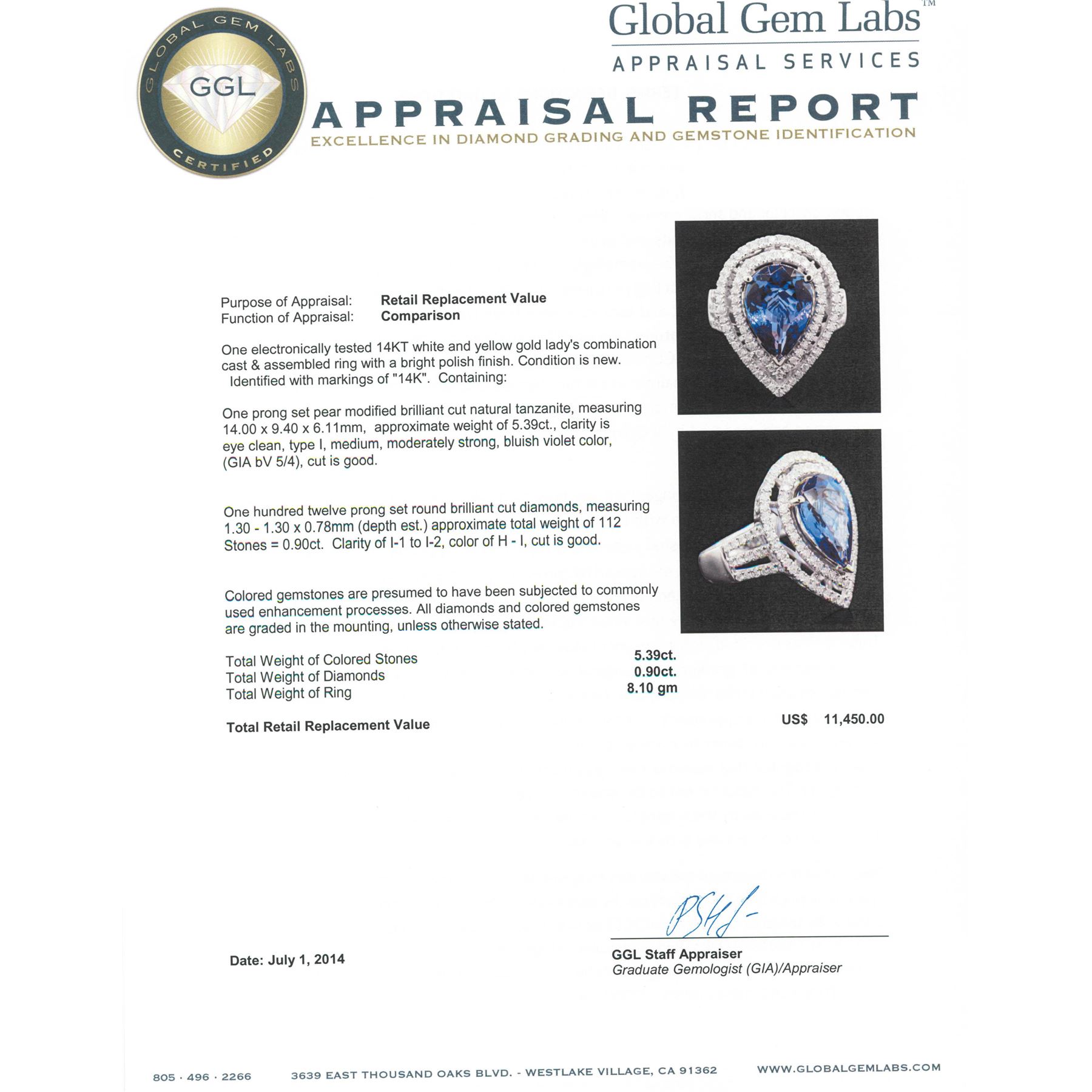 One electronically tested 14KT white and yellow gold Ladies combination cast & assembled ring with a bright polish finish. Condition is new. Identified with markings of "14K". Containing: One prong set pear modified brilliant cut natural tanzanite, measuring 14.00 x 9.40 x 6.11mm, approximate weight of 5.39ct., clarity is eye clean, type I, medium, moderately strong, bluish violet color, (GIA bV 5/4), cut is good. One Hundred Twelve prong set round brilliant cut diamonds, measuring 1.30 - 1.30 x 0.78mm (depth est.) approximate total weight of 112 Stones = 0.90ct. Clarity: I-1 to I-2. Color: H - I, Cut is Good. Colored gemstones are presumed to have been subjected to commonly used enhancement processes. All diamonds and colored gemstones are graded in the mounting, unless otherwise stated. Total Weight of Colored Stones 5.39ct. Total Weight of Diamonds 0.90ct. Total Weight of Ring 8.10 grams. GGL Appraised at $11,450.00.
