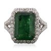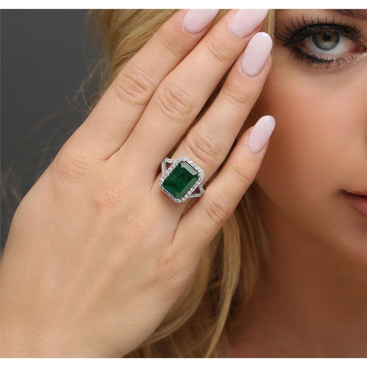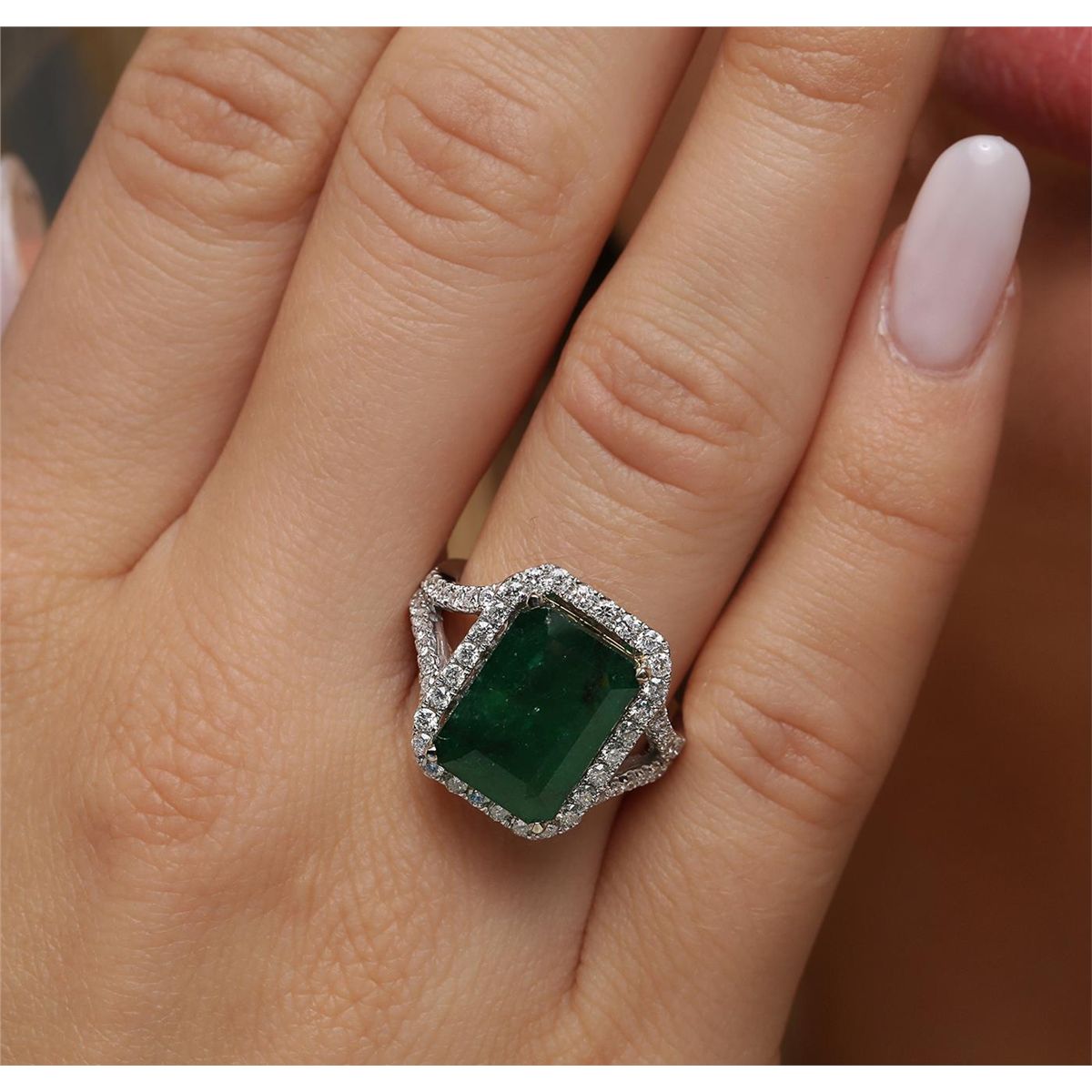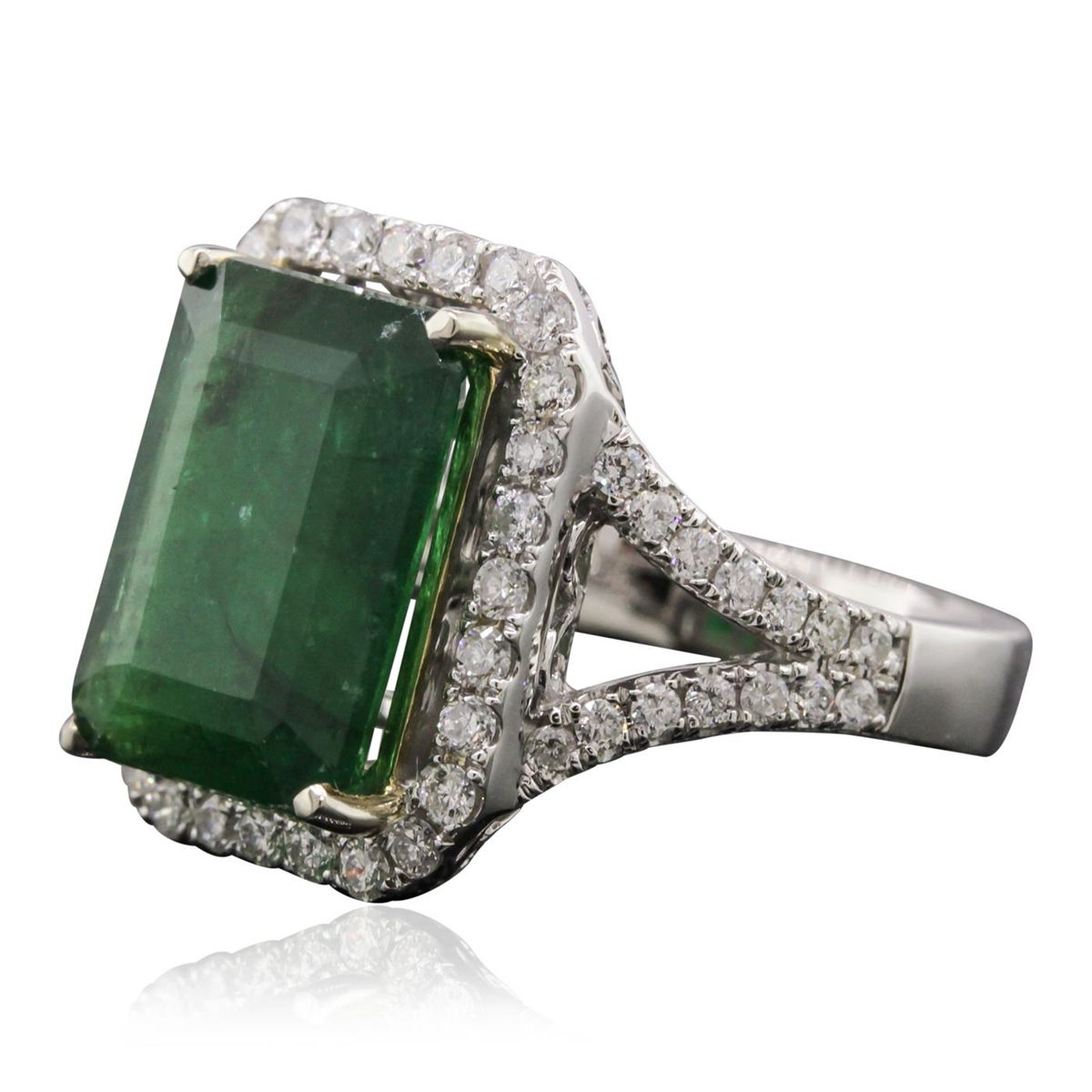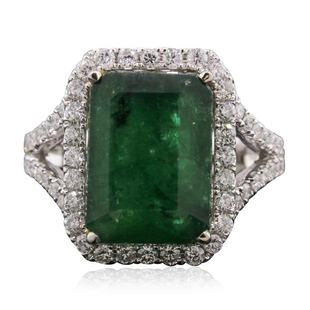 One electronically tested 14KT white and yellow gold Ladies combination cast & assembled ring with a bright polish finish. Condition is new. Identified with markings of "14K". Containing: One prong set emerald standard step cut natural emerald, measuring 13.78 x 9.96 x 6.48mm, approximate weight of 6.53ct., clarity is heavily included, type III, medium, moderately strong, green color, (GIA G 5/4), cut is good. Fifty-Six prong set round brilliant cut diamonds, measuring 1.60 - 1.50 x 0.93mm (depth est.) approximate total weight of 56 Stones = 0.76ct. Clarity: I-1 to I-2. Color: H - I, Cut is Good. Colored gemstones are presumed to have been subjected to commonly used enhancement processes. All diamonds and colored gemstones are graded in the mounting, unless otherwise stated. Total Weight of Colored Stones 6.53ct. Total Weight of Diamonds 0.76ct. Total Weight of Ring 8.60 grams. GGL Appraised at $16,585.00.