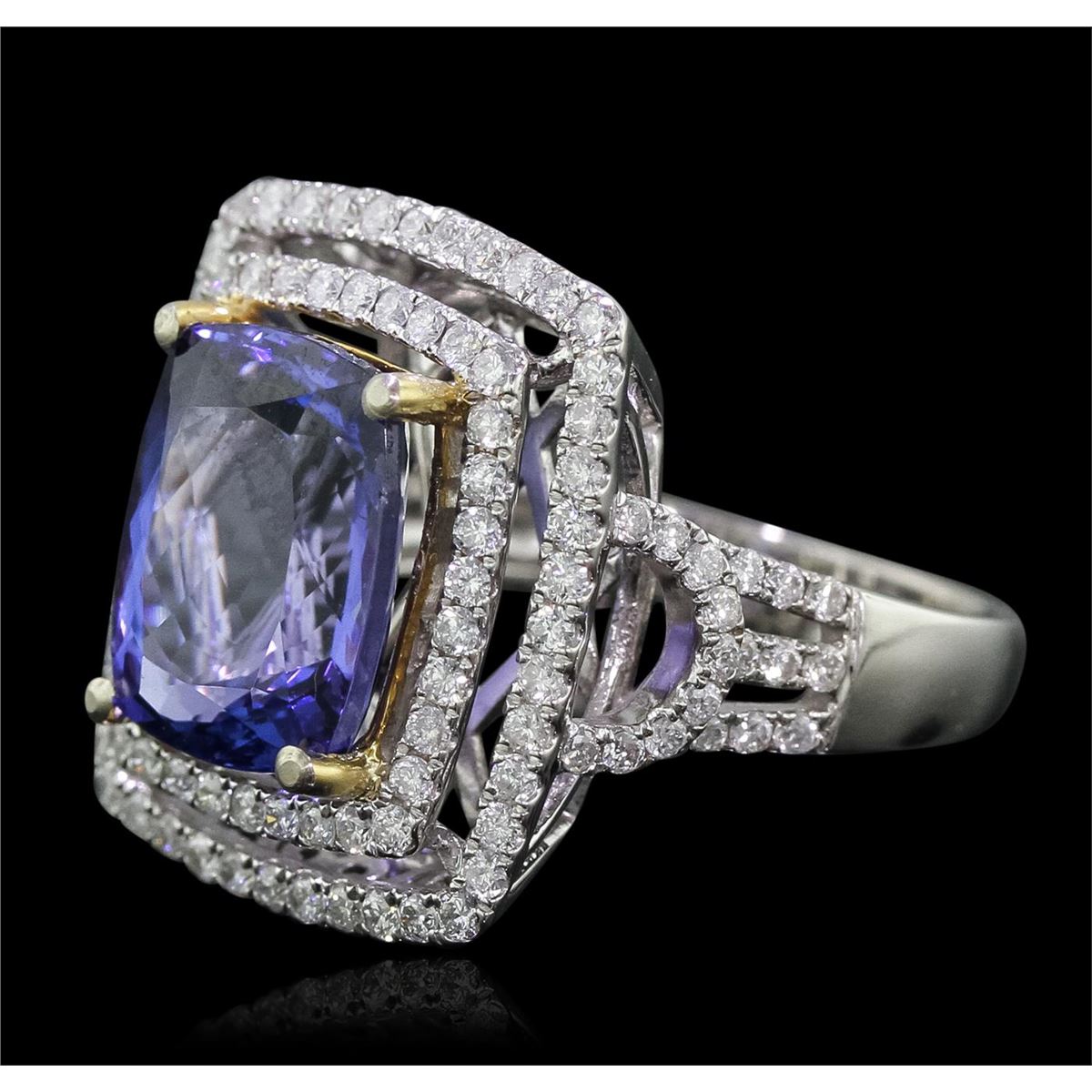 One electronically tested 14KT white and yellow gold Ladies combination cast & assembled ring with a bright polish finish. Condition is new. Identified with markings of "14K". Containing: One prong set rectangular cushion modified brilliant cut natural tanzanite, measuring 12.77 x 10.09 x 6.56mm, approximate weight of 6.65ct., clarity is eye clean, type I, medium, moderately strong, bluish violet color, (GIA bV 5/4), cut is good. Colored gemstones are presumed to have been subjected to commonly used color/clarity enhancement processes. One Hundred Fourteen prong set round brilliant cut diamonds, measuring 1.30 - 1.30 x 0.78mm (depth est.) approximate. Total Weight of 114 Stones = 0.91ct. Clarity: I-1 to I-2. Color: I - J, Cut is Good. Total Weight of Colored Stones 6.65ct. Total Weight of Diamonds 0.91ct. Total Weight of Ring 8.30 grams. GGL Appraised at $13,900.00.