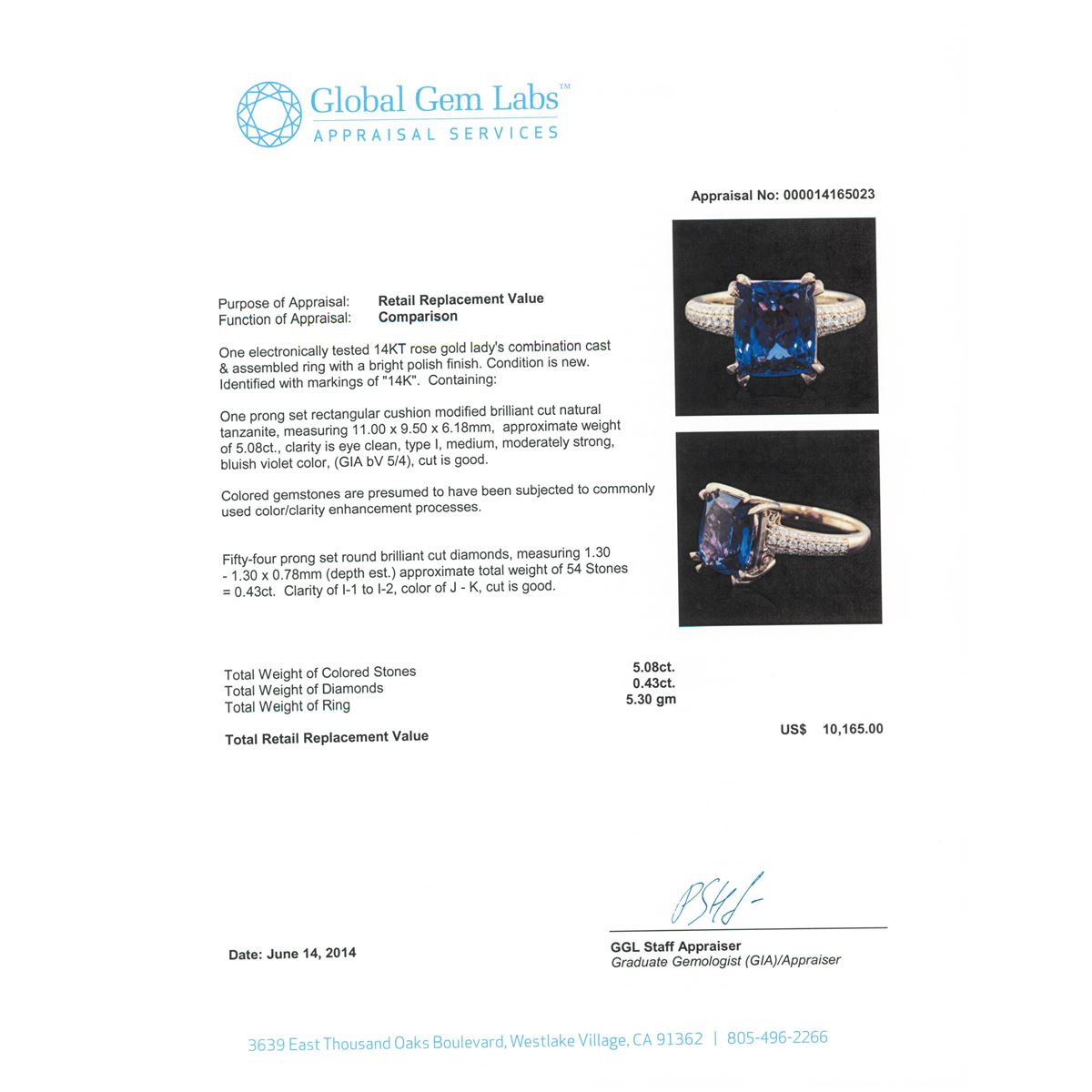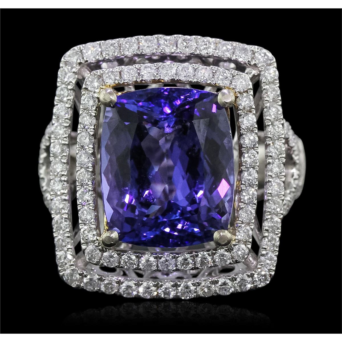 One electronically tested 14KT white and yellow gold Ladies combination cast & assembled ring with a bright polish finish. Condition is new. Identified with markings of "14K". Containing: One prong set rectangular cushion modified brilliant cut natural tanzanite, measuring 12.77 x 10.09 x 6.56mm, approximate weight of 6.65ct., clarity is eye clean, type I, medium, moderately strong, bluish violet color, (GIA bV 5/4), cut is good. Colored gemstones are presumed to have been subjected to commonly used color/clarity enhancement processes. One Hundred Fourteen prong set round brilliant cut diamonds, measuring 1.30 - 1.30 x 0.78mm (depth est.) approximate. Total Weight of 114 Stones = 0.91ct. Clarity: I-1 to I-2. Color: I - J, Cut is Good. Total Weight of Colored Stones 6.65ct. Total Weight of Diamonds 0.91ct. Total Weight of Ring 8.30 grams. GGL Appraised at $13,900.00.