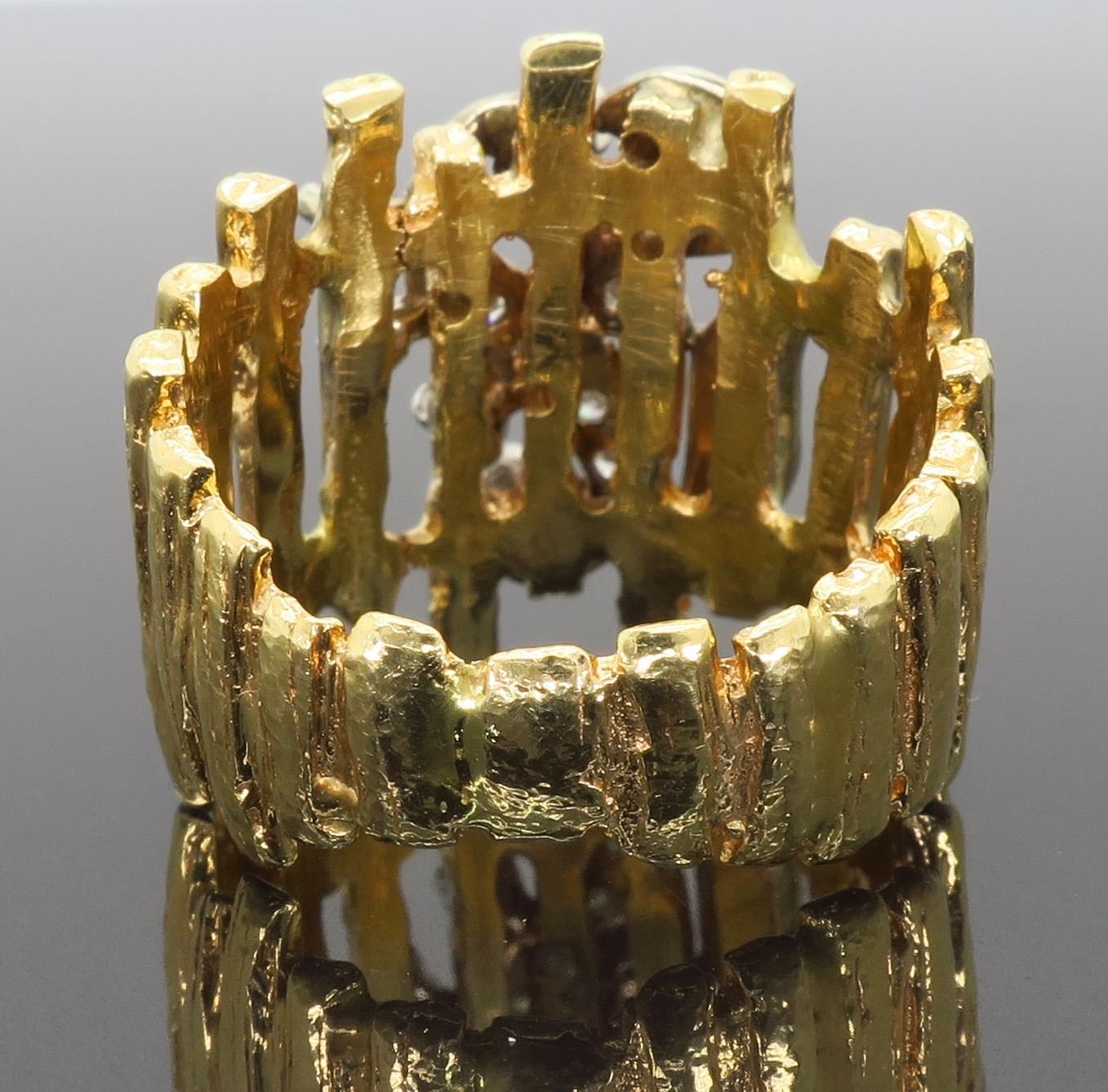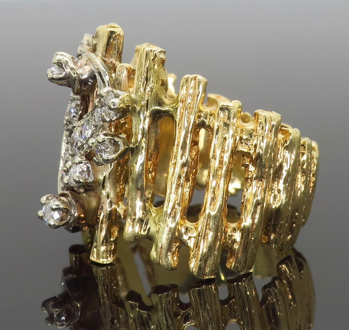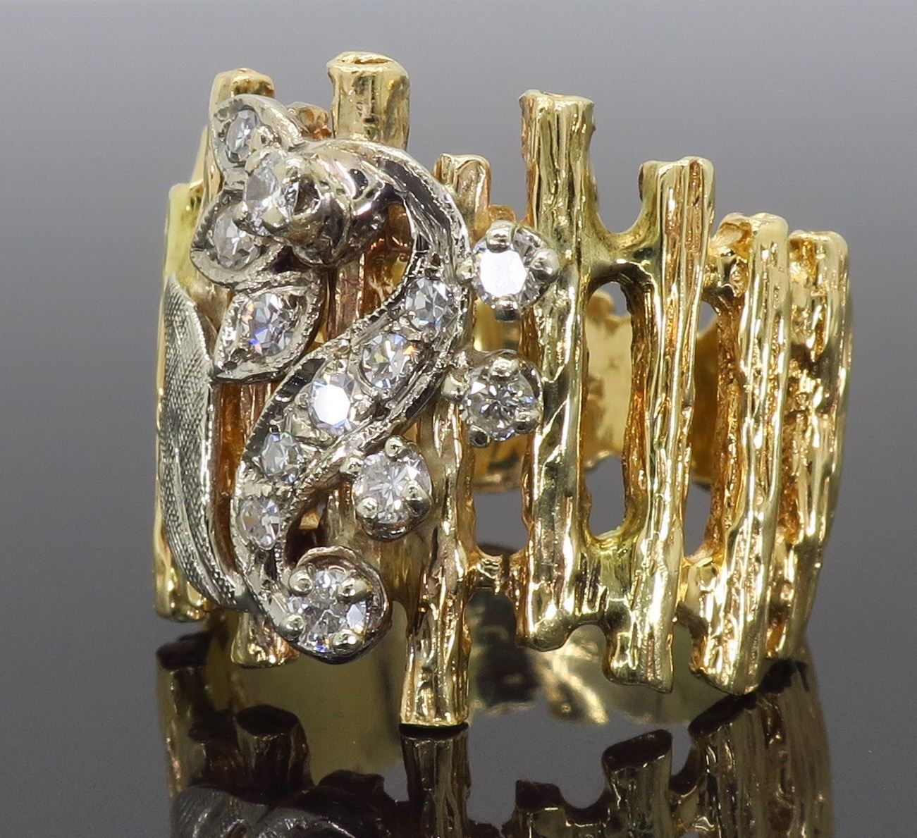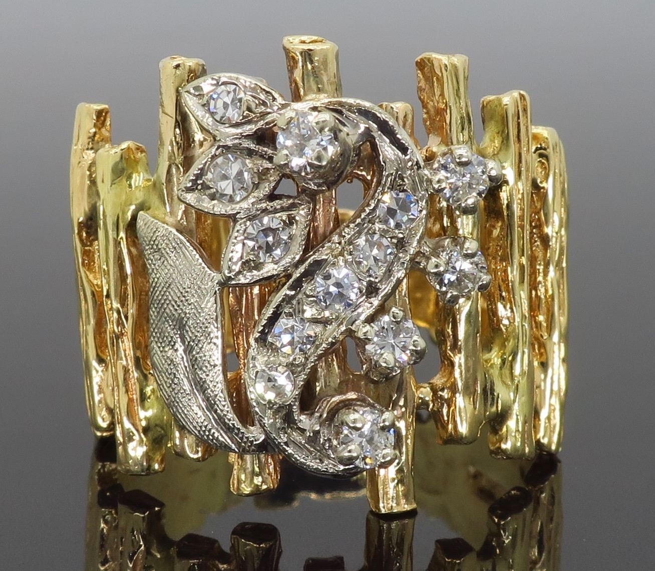 One 14KT Two Tone Gold 0.24ctw Diamond Ring. (8) single cut and (5) round Diamonds with a total weight of 0.24cts with a color of G-I and clarity of VS-2 to SI-2. Total weight of this ring is 9.7 grams. Ring size is 6.25.
