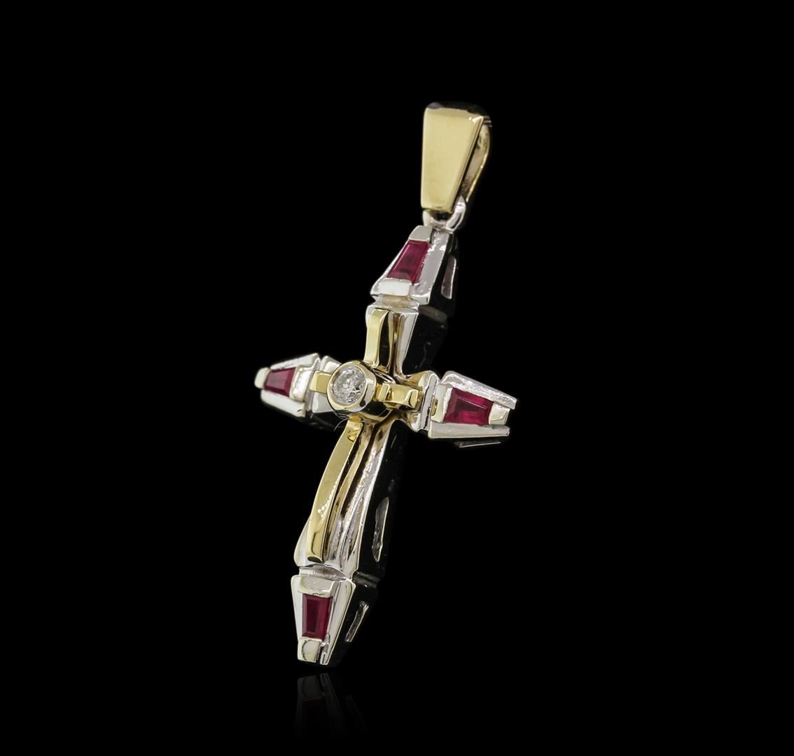One electronically tested 14KT white and yellow gold unisex cast ruby and diamond cross pendant with a bright polish finish. Condition is very good. Containing: Three bezel set baguette standard step cut natural rubies, measuring 3.00 x 2.00 x 1.30mm, approximate total weight of 0.24ct., clarity is heavily included, medium, moderately strong, strongly purplish red color, (GIA stpR 5/4), cut is good. One bezel set round brilliant cut diamond, measuring 3.00 - 3.00 x 1.80mm (depth est.) approximate weight of 0.10ct. Clarity: I-1. Color: J, Cut is Good. Colored gemstones are presumed to have been subjected to commonly used enhancement processes. All diamonds and colored gemstones are graded in the mounting, unless otherwise stated. Total Weight of Colored Stones 0.24ct. Total Weight of Diamonds 0.10ct. Total Weight of Cross Pendant 6.40 grams. GGL Appraised at $1,220.00.