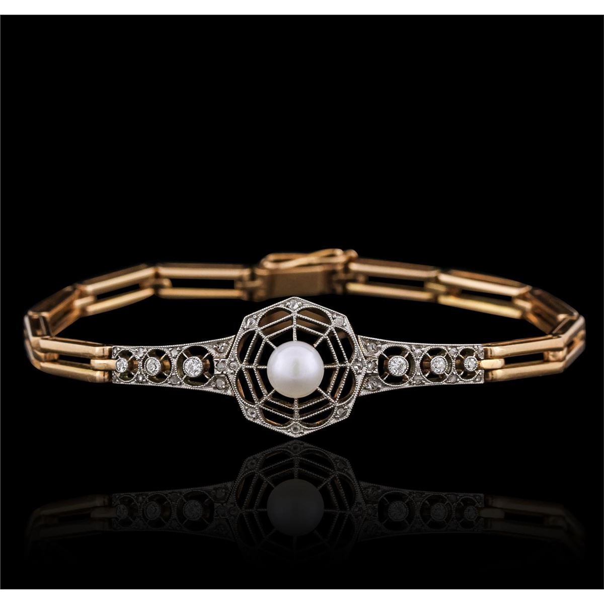 One electronically tested 14KT rose and white gold ladies hand assembled antique bracelet with a hidden box clasp with safety closer with a antiqued finish. Measurements: 7.50" in length. Condition is very good. Containing: One akoya cultured pearl, 6.5mm in size to 6.5mm in size. The pearl is white in color with a good luster, acceptable nacre, near round to off round, moderately blemished. Six gypsy set transitional cut diamonds, measuring 2.00 - 1.50 x 0.93mm (depth est.) approximate total weight of 6 Stones = 0.10ct. Clarity: SI-2 to I-1. Color: I - J, Cut is Good. Twenty-Six bead set rose cut diamonds, measuring 1.30 - 1.30 x 0.81mm (depth est.) approximate total weight of 26 Stones = 0.15ct. Clarity: I-1 to I-2. Color: I - J. Colored gemstones are presumed to have been subjected to commonly used enhancement processes. All diamonds and colored gemstones are graded in the mounting, unless otherwise stated. Total Weight of Diamonds 0.26ct. Total Weight of Bracelet 18.20 grams. GGL Appraised at $6,885.00.