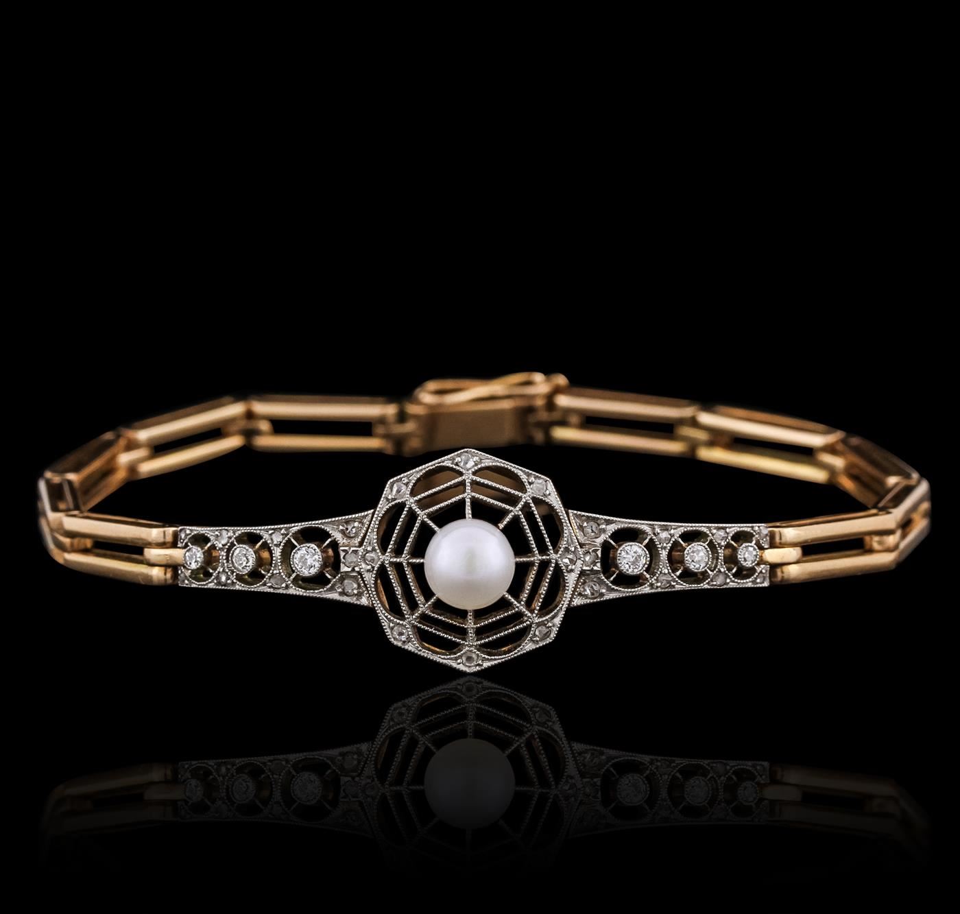 One electronically tested 14KT rose and white gold ladies hand assembled antique bracelet with a hidden box clasp with safety closer with a antiqued finish. Measurements: 7.50" in length. Condition is very good. Containing: One akoya cultured pearl, 6.5mm in size to 6.5mm in size. The pearl is white in color with a good luster, acceptable nacre, near round to off round, moderately blemished. Six gypsy set transitional cut diamonds, measuring 2.00 - 1.50 x 0.93mm (depth est.) approximate total weight of 6 Stones = 0.10 ct. Clarity: SI-2 to I-1. Color: I - J, Cut is Good. Twenty-Six bead set rose cut diamonds, measuring 1.30 - 1.30 x 0.81mm (depth est.) approximate total weight of 26 Stones = 0.15ct. Clarity: I-1 to I-2. Color: I - J. Colored gemstones are presumed to have been subjected to commonly used enhancement processes. All diamonds and colored gemstones are graded in the mounting, unless otherwise stated. Total Weight of Diamonds 0.26ct. Total Weight of Bracelet 18.20 grams. GGL Appraised.