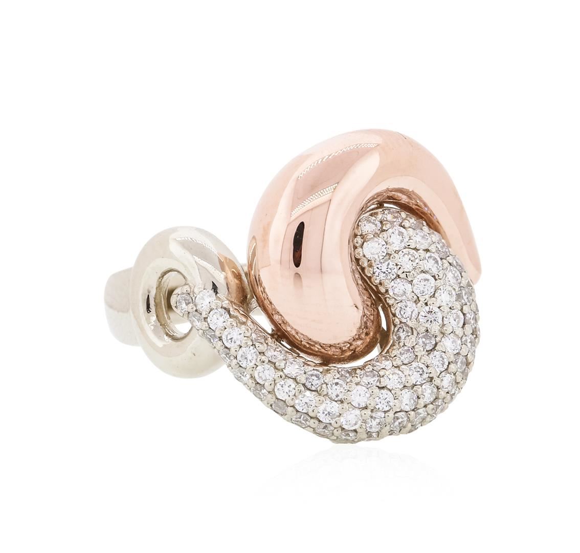 One electronically tested 14KT rose and white gold ladies combination cast & assembled diamond ring with a flat shank with rounded edges with a bright polish finish. Identified with markings of "K14". Condition is new. Containing: Eighty-Two prong set round brilliant cut diamonds, measuring 1.10 - 1.10 x 0.66mm (depth est.) approximate total weight of 82 Stones = 0.39ct. Clarity: I-1. Color: H - I, Cut is Good. All diamonds are graded in the mounting, unless otherwise stated. Total Weight of Diamonds 0.39ct. Total Weight of Ring 6.50 grams. GGL Appraised at $3,565.00.