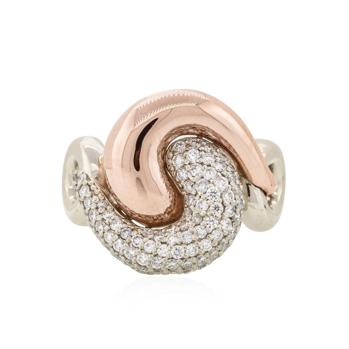 One electronically tested 14KT rose and white gold ladies combination cast & assembled diamond ring with a flat shank with rounded edges with a bright polish finish. Identified with markings of "K14". Condition is new. Containing: Eighty-Two prong set round brilliant cut diamonds, measuring 1.10 - 1.10 x 0.66mm (depth est.) approximate total weight of 82 Stones = 0.39ct. Clarity: I-1. Color: H - I, Cut is Good. All diamonds are graded in the mounting, unless otherwise stated. Total Weight of Diamonds 0.39ct. Total Weight of Ring 6.50 grams. GGL Appraised at $3,565.00.