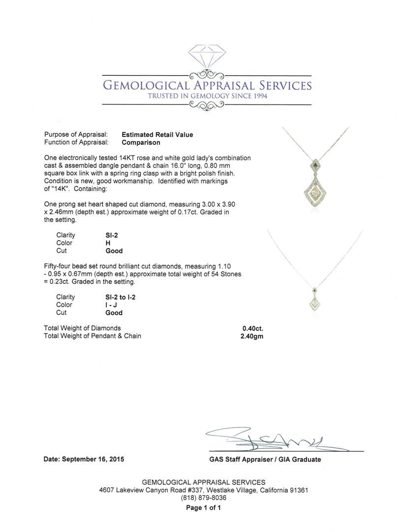One electronically tested 14KT rose and white gold lady's combination cast & assembled dangle pendant & chain 16.0" long, 0.80 mm square box link with a spring ring clasp with a bright polish finish. Identified with markings of "14K". Condition is new, good workmanship. Containing: One prong set heart shaped cut diamond, measuring 3.00 x 3.90 x 2.46mm (depth est.) approximate weight of 0.17ct. Graded in the setting. Clarity: SI-2. Color: Good Fifty-Four bead set round brilliant cut diamonds, measuring 1.10 - 0.95 x 0.67mm (depth est.) approximate total weight of 54 Stones = 0.23ct. Graded in the setting. Clarity: SI-2 to I-2. Color: I - Good. Total Weight of Diamonds 0.40ct. Total Weight of Pendant & Chain 2.40gm. GAS Appraised.