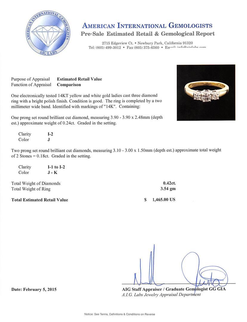 One electronically tested 14KT yellow and white gold ladies cast three diamond ring with a bright polish finish. The ring is completed by a two millimeter wide band. Identified with markings of "14K". Condition is good. Containing: One prong set round brilliant cut diamond, measuring 3.90 - 3.90 x 2.48mm (depth est.) approximate weight of 0.24ct. Graded in the setting. Clarity: I-2. Color: J Two prong set round brilliant cut diamonds, measuring 3.10 - 3.00 x 1.50mm (depth est.) approximate total weight of 2 Stones = 0.18ct. Graded in the setting. Clarity: I-1 to I-2. Color: J - K. Total Weight of Diamonds 0.42ct. Total Weight of Ring 3.54 grams. AIG Appraised at $1,465.00.