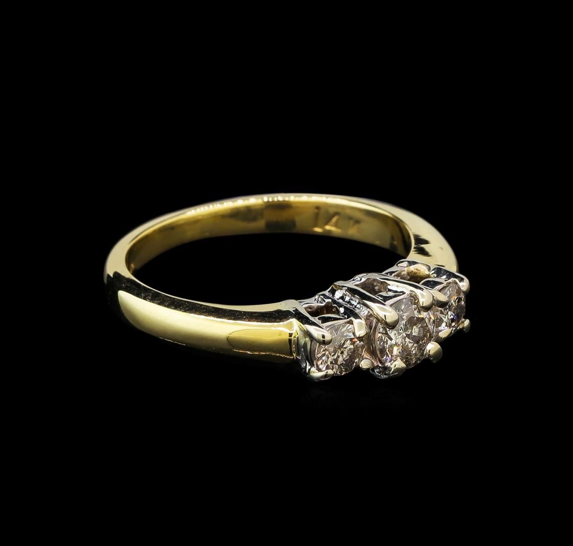 One electronically tested 14KT yellow and white gold ladies cast three diamond ring with a bright polish finish. The ring is completed by a two millimeter wide band. Identified with markings of "14K". Condition is good. Containing: One prong set round brilliant cut diamond, measuring 3.90 - 3.90 x 2.48mm (depth est.) approximate weight of 0.24ct. Graded in the setting. Clarity: I-2. Color: J Two prong set round brilliant cut diamonds, measuring 3.10 - 3.00 x 1.50mm (depth est.) approximate total weight of 2 Stones = 0.18ct. Graded in the setting. Clarity: I-1 to I-2. Color: J - K. Total Weight of Diamonds 0.42ct. Total Weight of Ring 3.54 grams. AIG Appraised at $1,465.00.