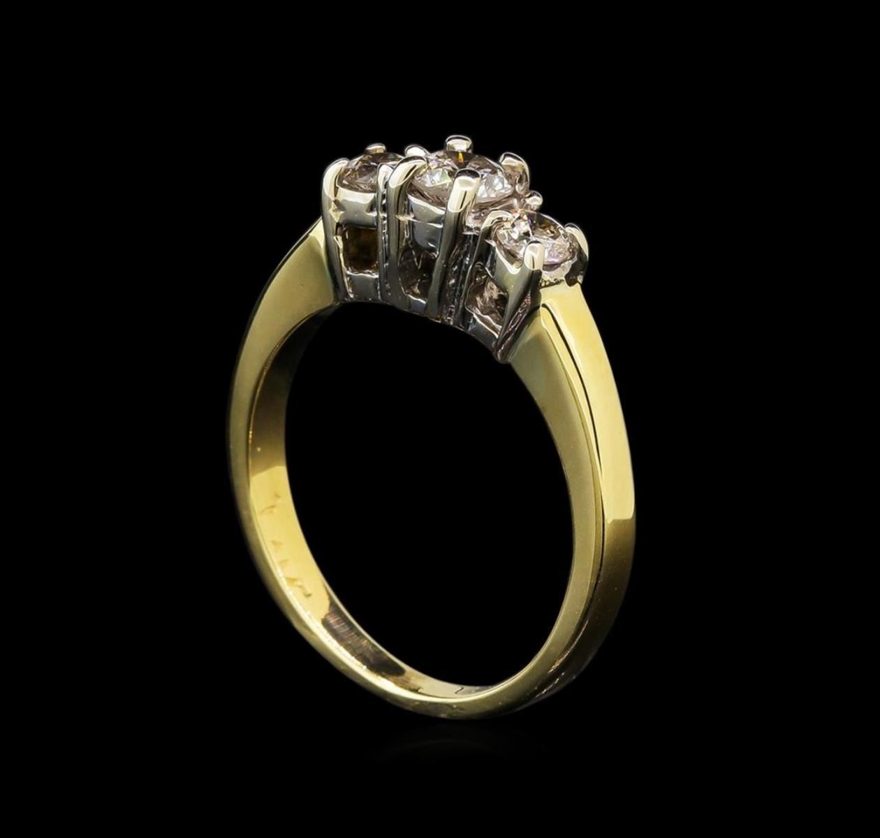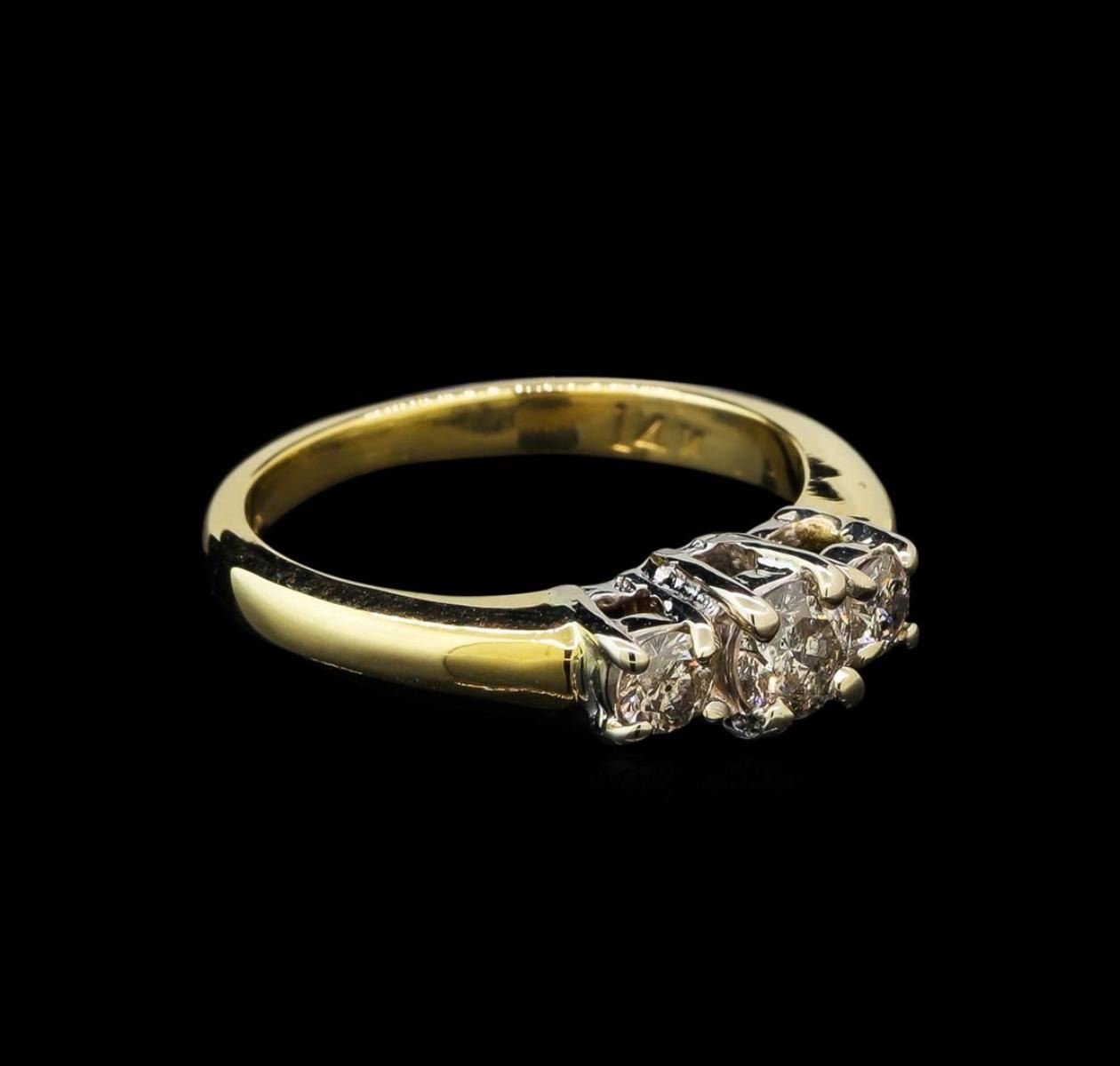 One electronically tested 14KT yellow and white gold ladies cast three diamond ring with a bright polish finish. The ring is completed by a two millimeter wide band. Identified with markings of "14K". Condition is good. Containing: One prong set round brilliant cut diamond, measuring 3.90 - 3.90 x 2.48mm (depth est.) approximate weight of 0.24ct. Graded in the setting. Clarity: I-2. Color: J Two prong set round brilliant cut diamonds, measuring 3.10 - 3.00 x 1.50mm (depth est.) approximate total weight of 2 Stones = 0.18ct. Graded in the setting. Clarity: I-1 to I-2. Color: J - K. Total Weight of Diamonds 0.42ct. Total Weight of Ring 3.54 grams. AIG Appraised.