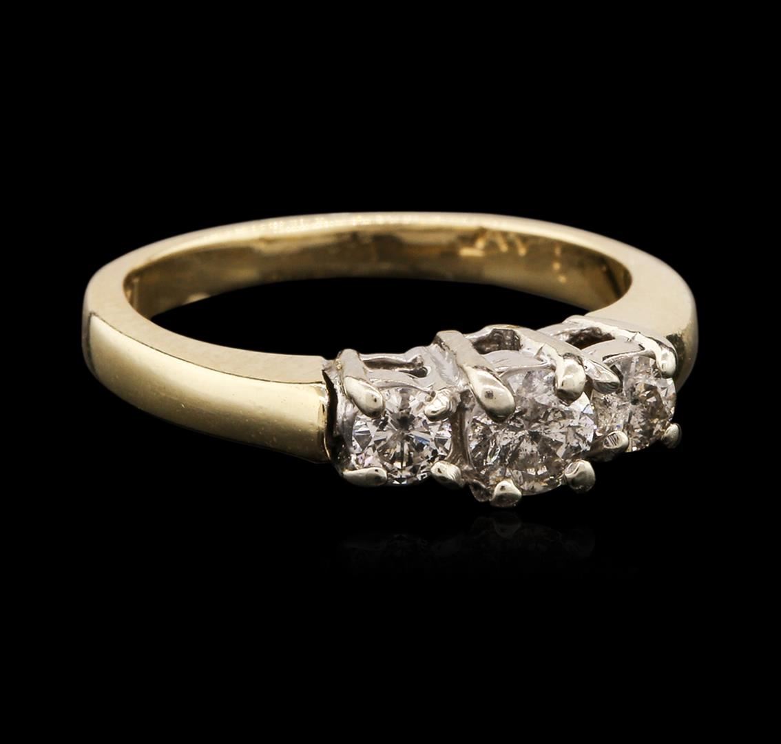 One electronically tested 14KT yellow and white gold ladies cast three diamond ring with a bright polish finish. The ring is completed by a two millimeter wide band. Identified with markings of "14K". Condition is good. Containing: One prong set round brilliant cut diamond, measuring 3.90 - 3.90 x 2.48mm (depth est.) approximate weight of 0.24ct. Graded in the setting. Clarity: I-2. Color: J Two prong set round brilliant cut diamonds, measuring 3.10 - 3.00 x 1.50mm (depth est.) approximate total weight of 2 Stones = 0.18ct. Graded in the setting. Clarity: I-1 to I-2. Color: J - K. Total Weight of Diamonds 0.42ct. Total Weight of Ring 3.54 grams. AIG Appraised at $1,465.00.