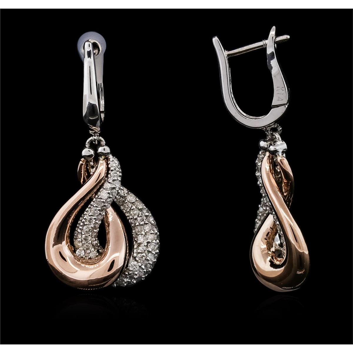 One pair electronically tested 14KT rose and white gold ladies cast diamond earrings with hinged clip backs with a bright polish finish. Identified with markings of "K14". Condition is new. Containing: One Hundred Ten bead set round brilliant cut diamonds, measuring 1.10 - 1.10 x 0.66mm (depth est.) approximate total weight of 110 Stones = 0.53ct. Clarity: I-1 to I-2. Color: I - J, Cut is Good. All diamonds are graded in the mounting, unless otherwise stated. Total Weight of Diamonds 0.53ct. Total Weight of Earrings 8.00 grams. GGL Appraised at $3,685.00.