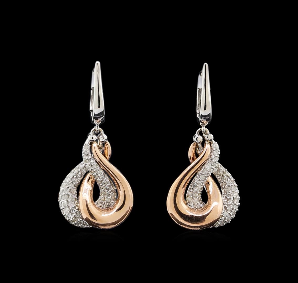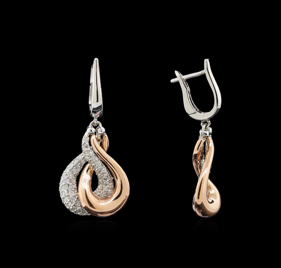One pair electronically tested 14KT rose and white gold ladies cast diamond earrings with hinged clip backs with a bright polish finish. Identified with markings of "K14". Condition is new. Containing: One Hundred Ten bead set round brilliant cut diamonds, measuring 1.10 - 1.10 x 0.66mm (depth est.) approximate total weight of 110 Stones = 0.53ct. Clarity: I-1 to I-2. Color: I - J, Cut is Good. All diamonds are graded in the mounting, unless otherwise stated. Total Weight of Diamonds 0.53ct. Total Weight of Earrings 8.00 grams. GGL Appraised at $3,685.00.