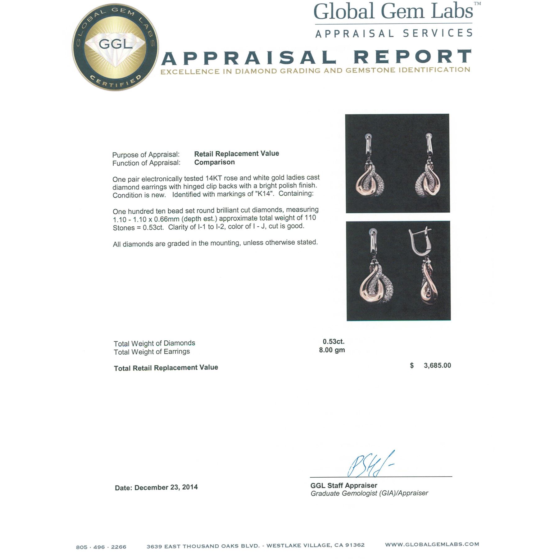 One pair electronically tested 14KT rose and white gold ladies cast diamond earrings with hinged clip backs with a bright polish finish. Identified with markings of "K14". Condition is new. Containing: One Hundred Ten bead set round brilliant cut diamonds, measuring 1.10 - 1.10 x 0.66mm (depth est.) approximate total weight of 110 Stones = 0.53ct. Clarity: I-1 to I-2. Color: I - J, Cut is Good. All diamonds are graded in the mounting, unless otherwise stated. Total Weight of Diamonds 0.53ct. Total Weight of Earrings 8.00 grams. GGL Appraised at $3,685.00.