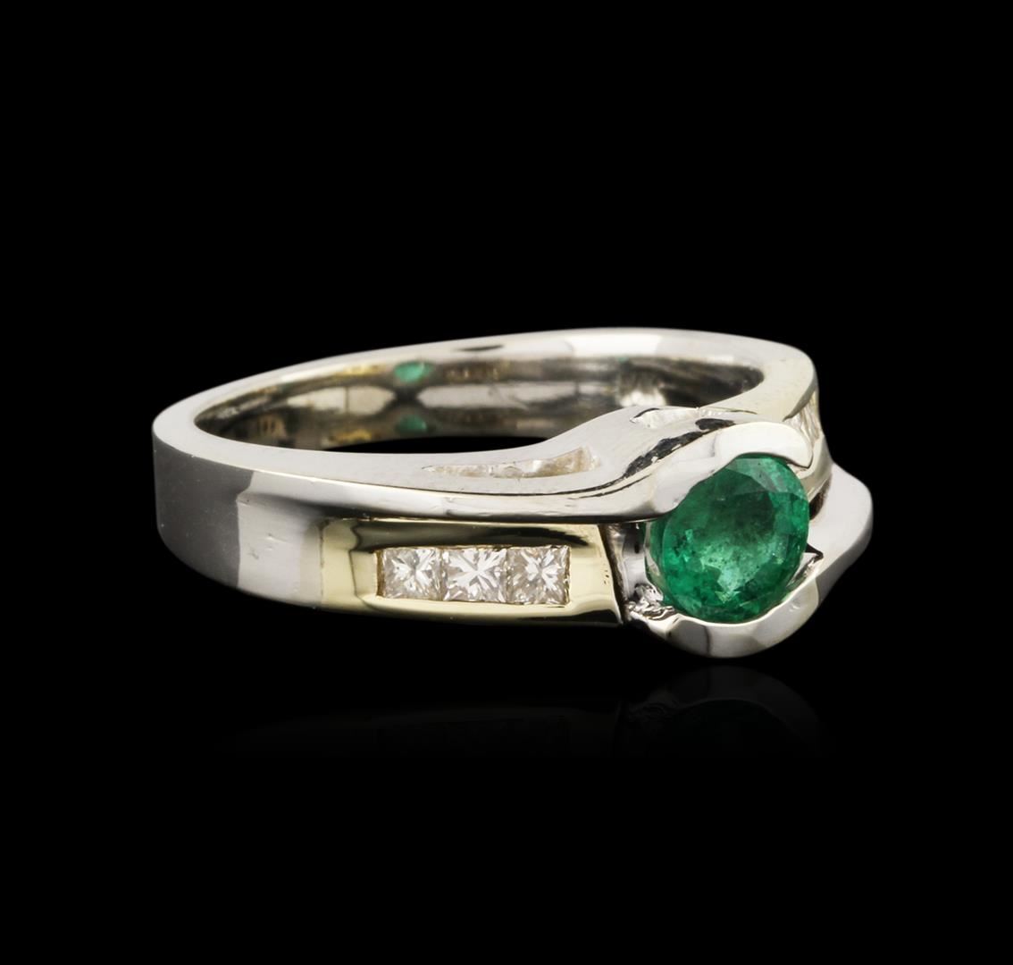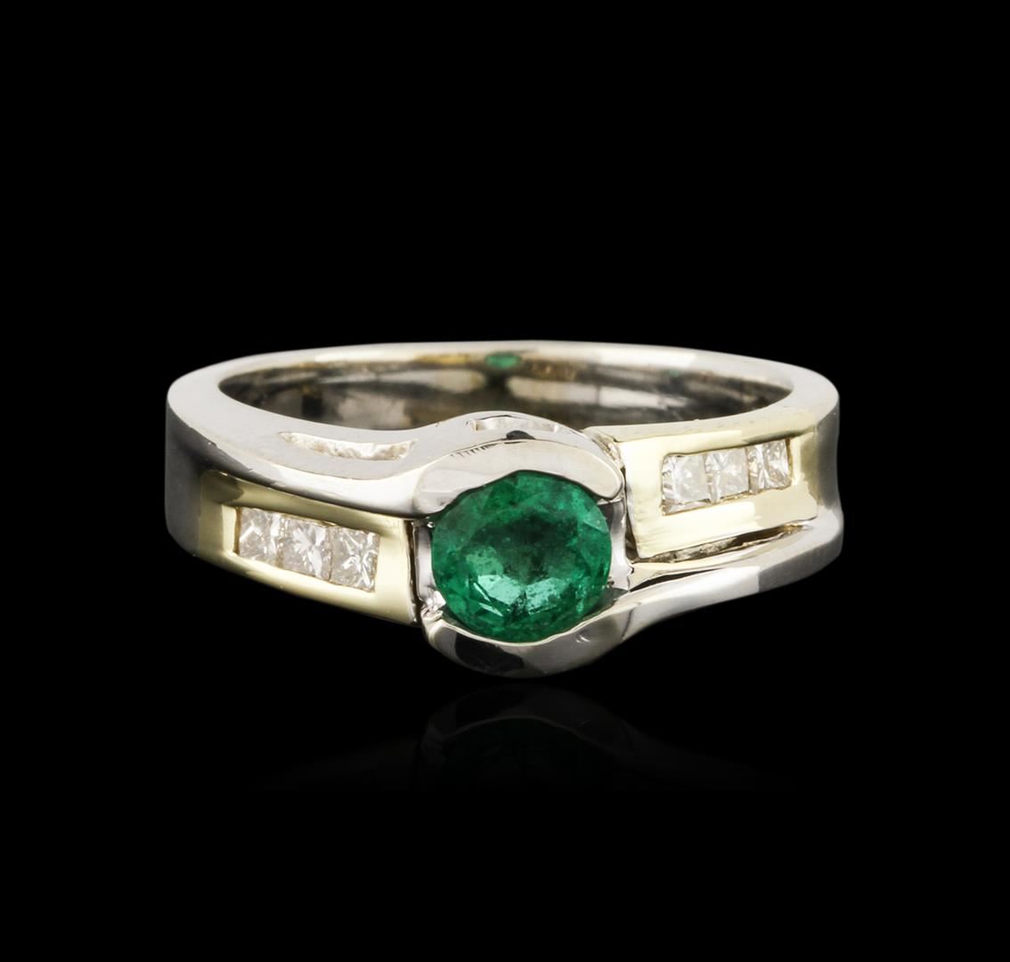 One ring featuring: 14KT white and yellow gold weighing 5.53 grams containing one round cut emerald center weighing 0.55ct and six princess cut diamonds weighing a total of 0.28ct.