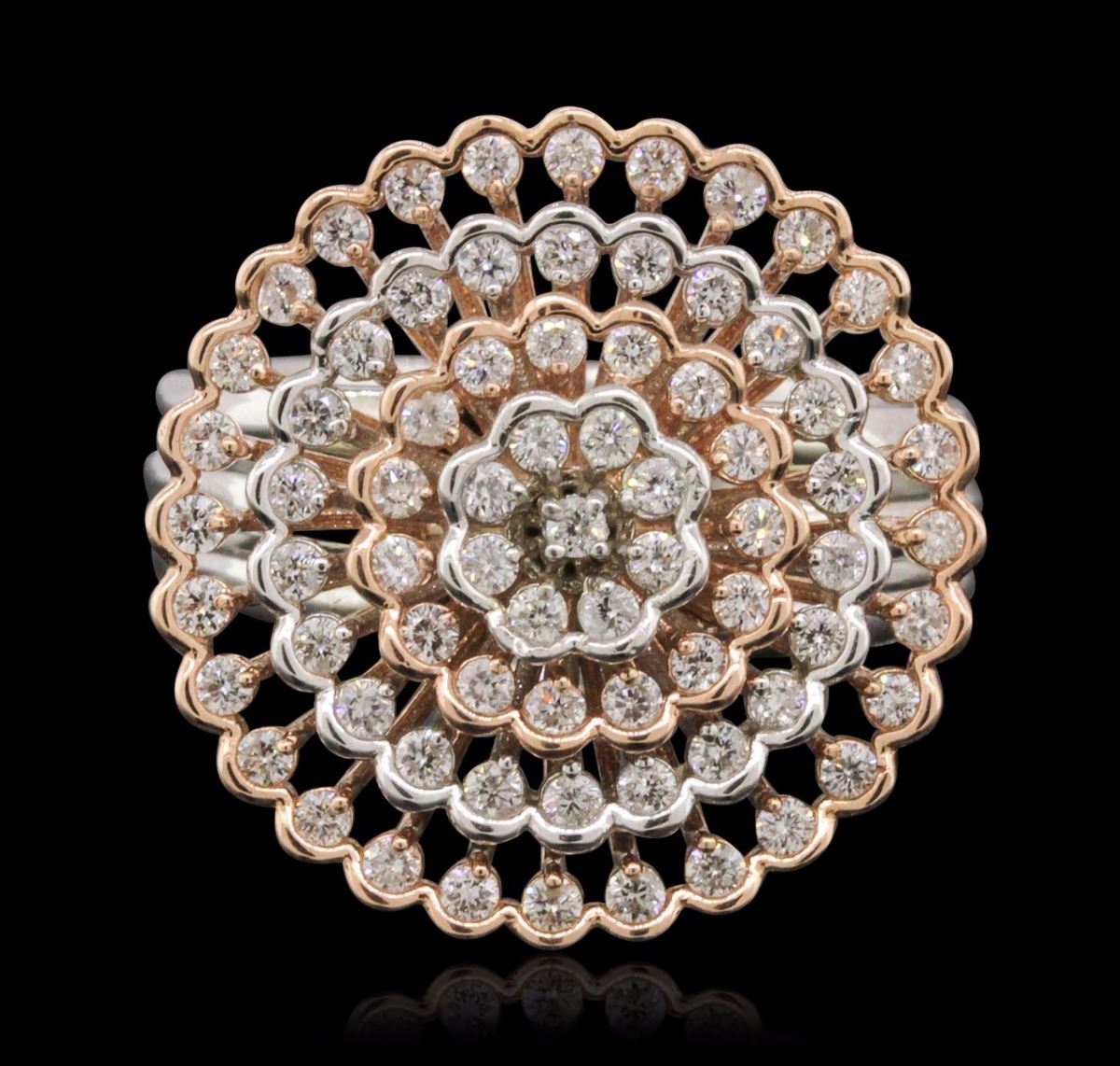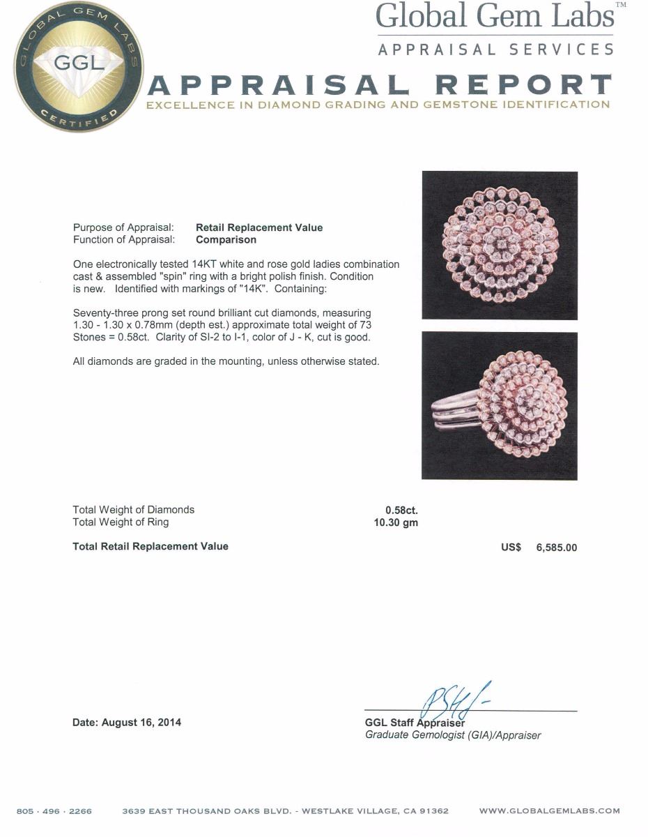 One electronically tested 14KT white and rose gold ladies combination cast & assembled "spin" ring with a bright polish finish. Condition is new. Identified with markings of "14K". Containing: Seventy-Three prong set round brilliant cut diamonds, measuring 1.30 - 1.30 x 0.78mm (depth est.) approximate. Total Weight of 73 Stones = 0.58ct. Clarity: SI-2 to I-1. Color: J - K, Cut is Good. All diamonds are graded in the mounting, unless otherwise stated. Total Weight of Diamonds 0.58ct. Total Weight of Ring 10.30 grams. GGL Appraised at $6,585.00.