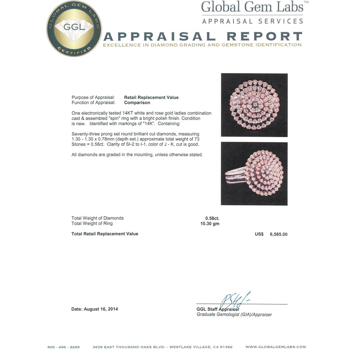 One electronically tested 14KT white and rose gold ladies combination cast & assembled "spin" ring with a bright polish finish. Condition is new. Identified with markings of "14K". Containing: Seventy-Three prong set round brilliant cut diamonds, measuring 1.30 - 1.30 x 0.78mm (depth est.) approximate. Total Weight of 73 Stones = 0.58ct. Clarity: SI-2 to I-1. Color: J - K, Cut is Good. All diamonds are graded in the mounting, unless otherwise stated. Total Weight of Diamonds 0.58ct. Total Weight of Ring 10.30 grams. GGL Appraised at $6,585.00.