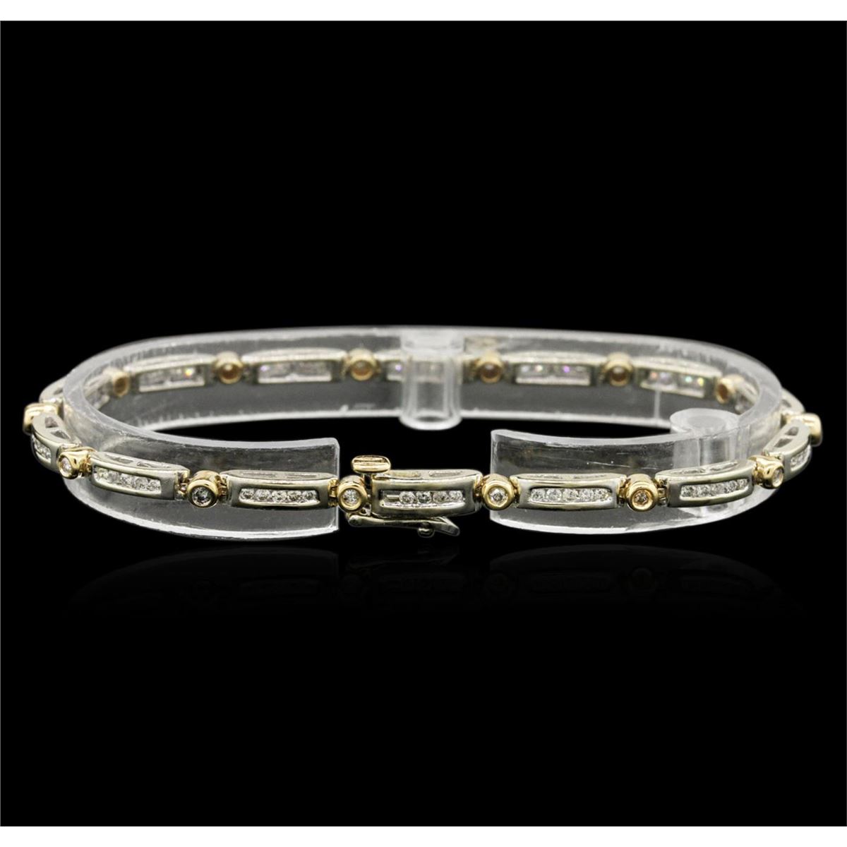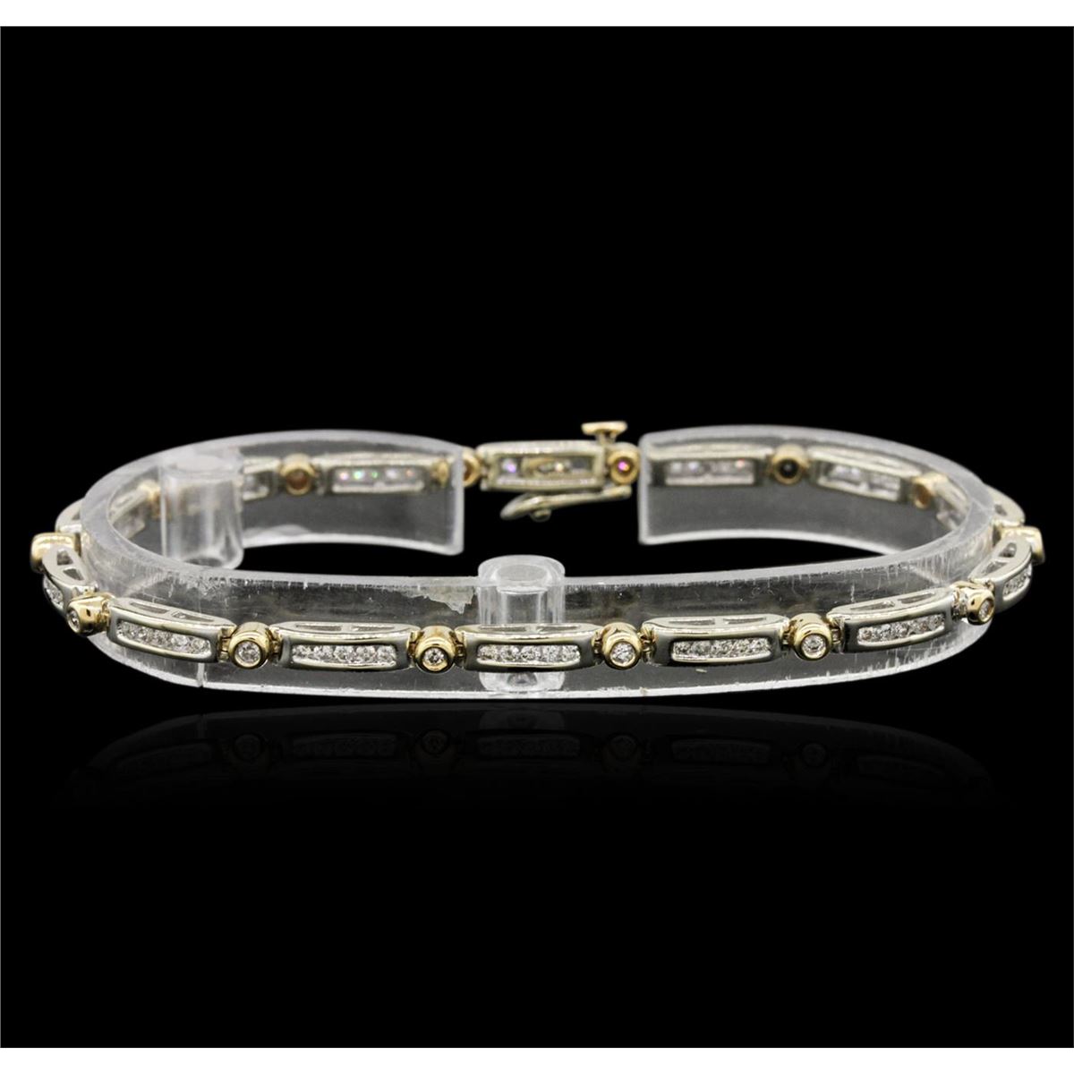 One electronically tested 14KT white and yellow gold ladies cast diamond bracelet with a hidden box clasp with safety closer with a bright polish finish. Measurements: 7.5" in length Identified with markings of "14K". Condition is new. Containing: Eighty-Three prong set round brilliant cut diamonds, measuring 1.20 - 1.30 x 0.75mm (depth est.) approximate total weight of 83 Stones = 0.59ct. Clarity: SI-2 to I-1. Color: I - J, Cut is Good. All diamonds are graded in the mounting, unless otherwise stated. Total Weight of Diamonds 0.59ct. Total Weight of Bracelet 11.90 grams. GGL Appraised at $5,525.00.