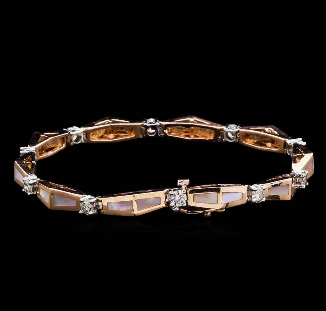 One electronically tested 14KT two-toned white and gold ladies cast and assembled diamond bracelet with a bright polish finish. Condition is good. Seven and one quarter inch length bracelet features a ribbon of chevron shaped rose gold links accented with mother or pearl inlay work, alternated by individually set diamonds, terminating in a concealed clasp with safety. Containing: Ten prong set round brilliant cut diamonds, measuring 3.50 - 3.50 x 2.10mm (depth est) approximate total weight of 10 stones = 0.67ct. Faint brown secondary color throughout. The clarity grade reflects the overall average for the group. Graded in the setting. Clarity I-1 Color I-K. Total weight of diamonds 0.67ct. Total weight of bracelet 19.50 grams. AIG Appraised.