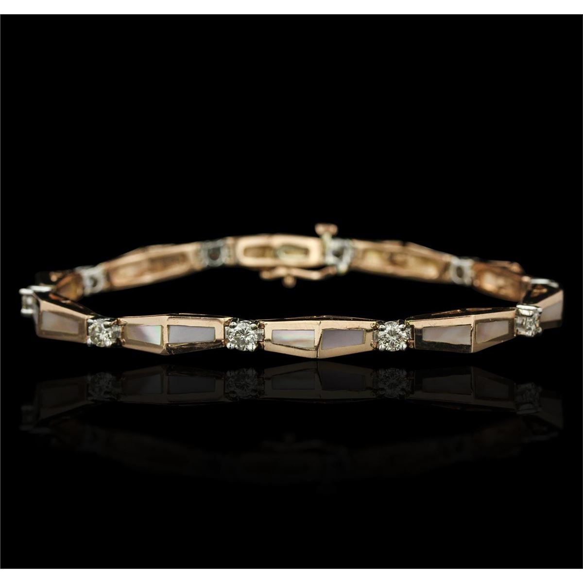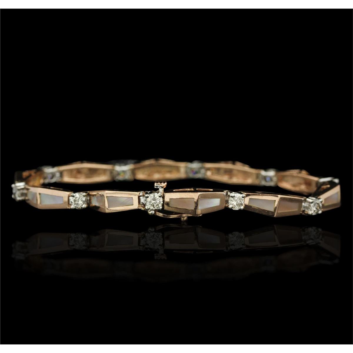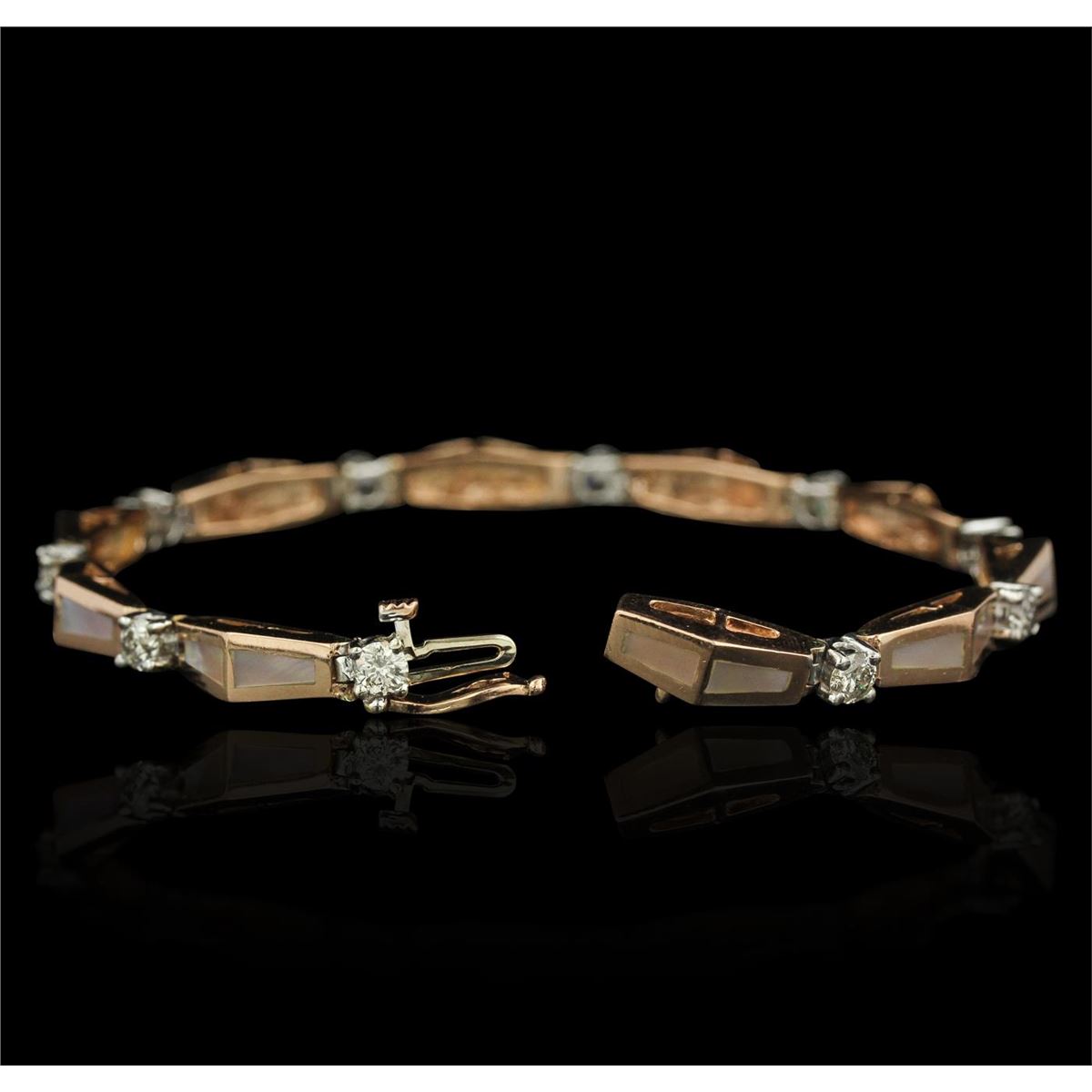 One electronically tested 14KT two-toned white and gold ladies cast and assembled diamond bracelet with a bright polish finish. Condition is good. Seven and one quarter inch length bracelet features a ribbon of chevron shaped rose gold links accented with mother or pearl inlay work, alternated by individually set diamonds, terminating in a concealed clasp with safety. Containing: Ten prong set round brilliant cut diamonds, measuring 3.50 - 3.50 x 2.10mm (depth est) approximate total weight of 10 stones = 0.67ct. Faint brown secondary color throughout. The clarity grade reflects the overall average for the group. Graded in the setting. Clarity I-1 Color I-K. Total weight of diamonds 0.67ct. Total weight of bracelet 19.50 grams. AIG Appraised at $5,220.00.