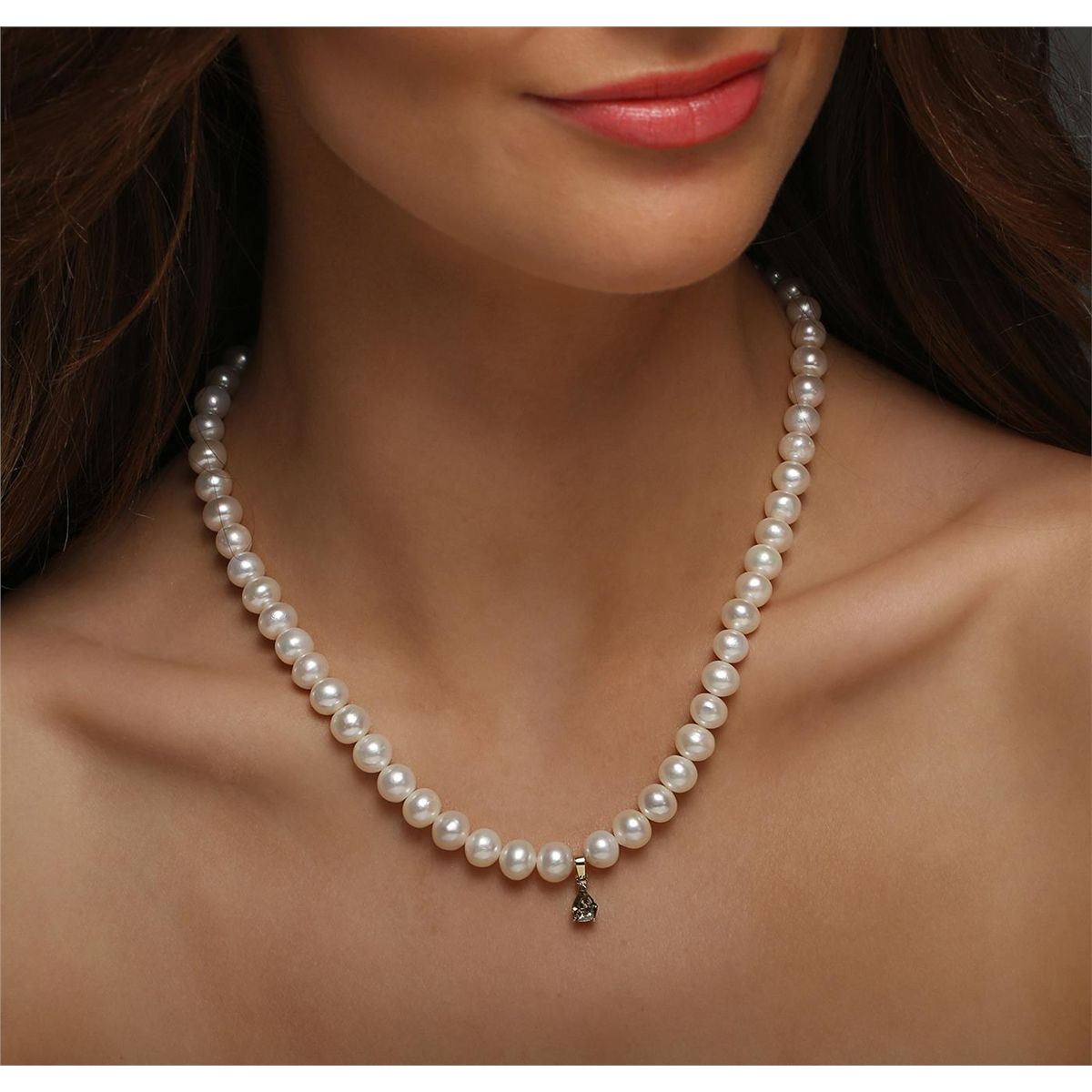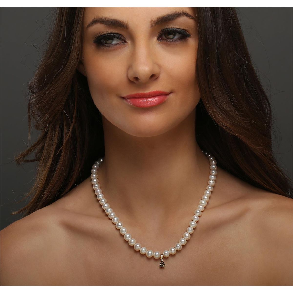One electronically tested 14KT yellow and white gold ladies hand assembled pearl and diamond necklace with a lobster claw clasp with a bright polish finish. Identified with markings of "14K". Condition is new. Containing: One single strand pearl necklace unknotted, containing 59 8.4mm in size to 8.5mm in size. The pearls are white in color with a good luster, acceptable nacre, off round, moderately blemished. One prong set shield cut diamond, measuring 5.66 x 6.90 x 3.05mm approximate weight of 0.68ct. Clarity: I-2, Cut is Good. All diamonds are graded in the mounting, unless otherwise stated. Total Weight of Diamonds 0.68ct. Total Weight of Necklace 40.50 grams. GGL Appraised at $2,095.00.