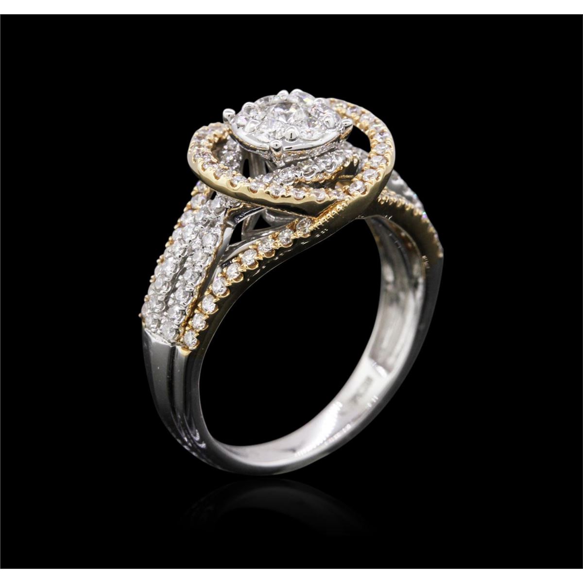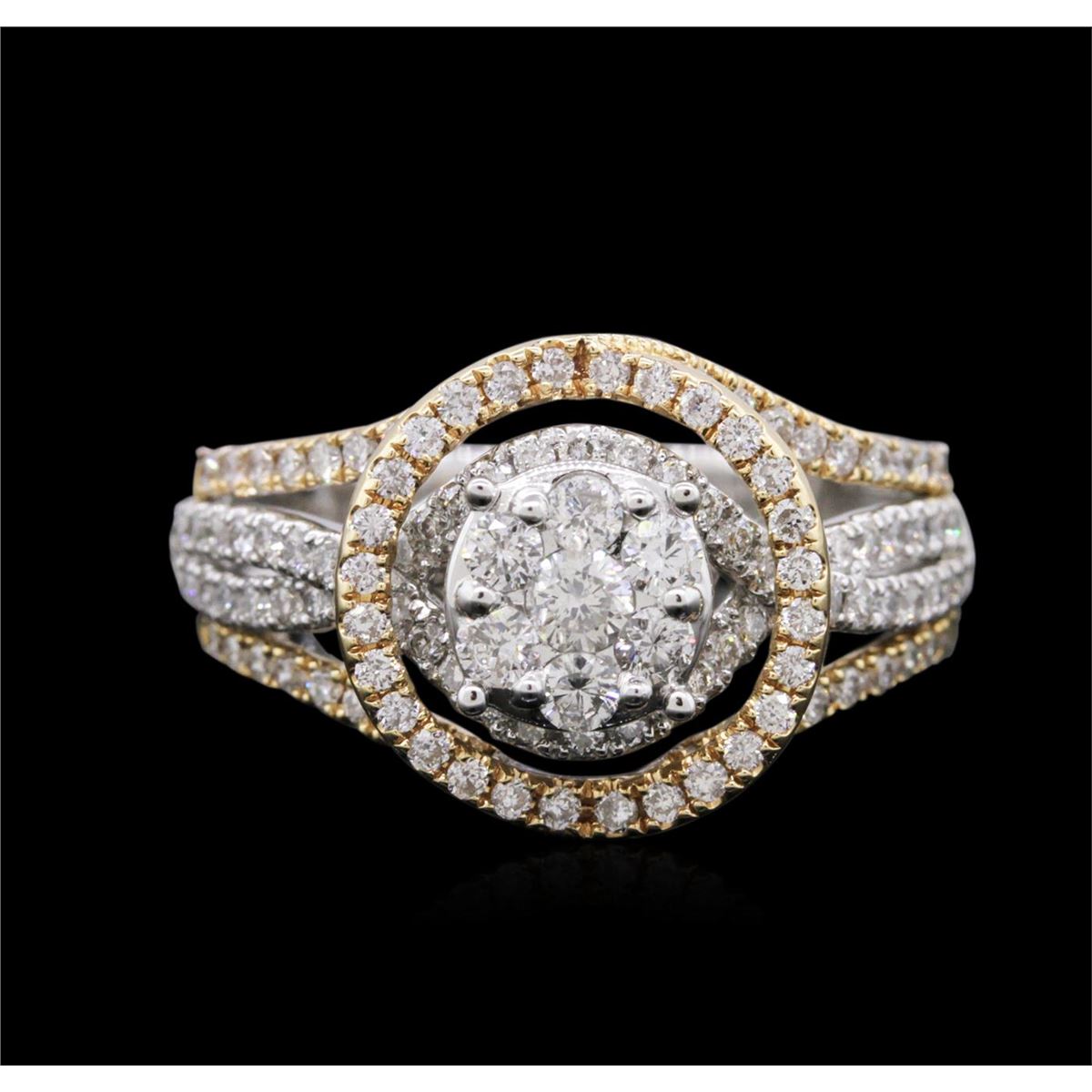 One electronically tested 14KT white and yellow gold ladies combination cast & assembled diamond ring with a bright polish finish. Identified with markings of "14K". Condition is new. Containing: Seven prong set round brilliant cut diamonds, measuring 2.50 - 2.00 x 1.35mm (depth est.) approximate total weight of 7 Stones = 0.25ct. Clarity: SI-1 to SI-2. Color: I - J, Cut is Good. One Hundred prong set round brilliant cut diamonds, measuring 1.20 - 1.00 x 0.66mm (depth est.) approximate total weight of 100 Stones = 0.48ct. Clarity: SI-2 to I-2. Color: I - J, Cut is Good. All diamonds are graded in the mounting, unless otherwise stated. Total Weight of Diamonds 0.73ct. Total Weight of Ring 5.40 grams. GGL Appraised at $3,935.00.