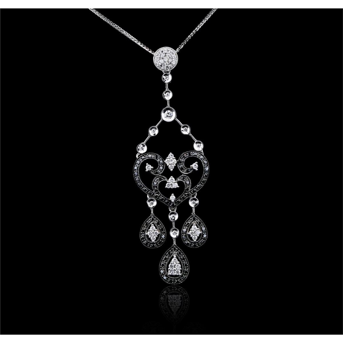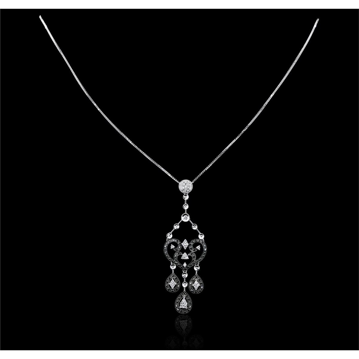 One electronically tested 14KT white and black gold ladies combination cast & assembled diamond pendant & chain 18.0" long, cable link with a spring ring clasp with a bright polish finish. Identified with markings of "14K". Condition is new. Containing: Seventy-Two prong set round brilliant cut diamonds, measuring 1.10 - 1.10 x 0.66mm (depth est.) approximate total weight of 72 Stones = 0.35ct. Cut is Good. Forty-Seven prong set round brilliant cut diamonds, measuring 2.00 - 1.10 x 0.93mm (depth est.) approximate total weight of 47 Stones = 0.40ct. Clarity: SI-2 to I-1. Color: I - J, Cut is Good. All diamonds are graded in the mounting, unless otherwise stated. Total Weight of Diamonds 0.75ct. Total Weight of Pendant & Chain 9.20 grams. GGL Appraised at $4,110.00.