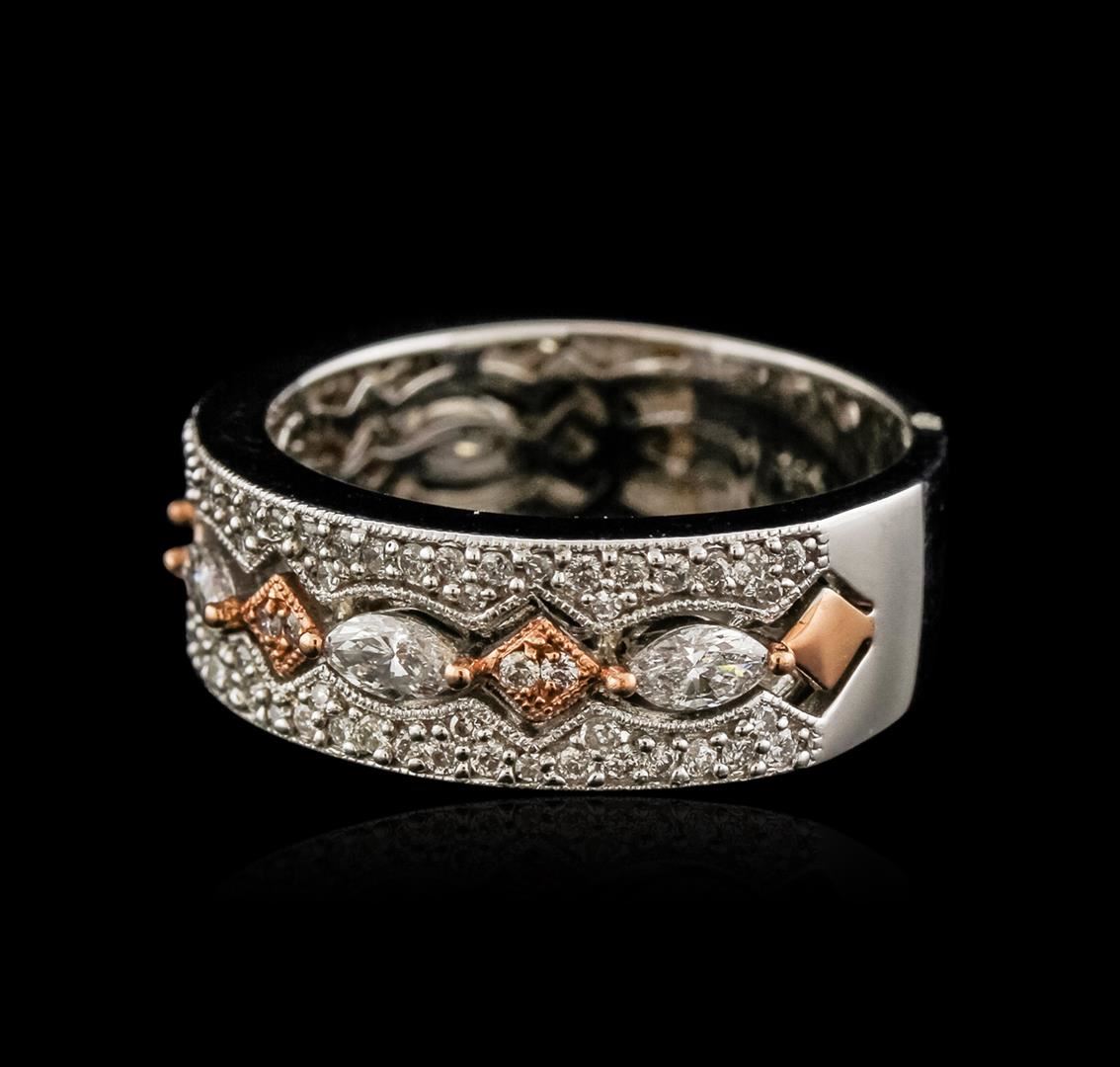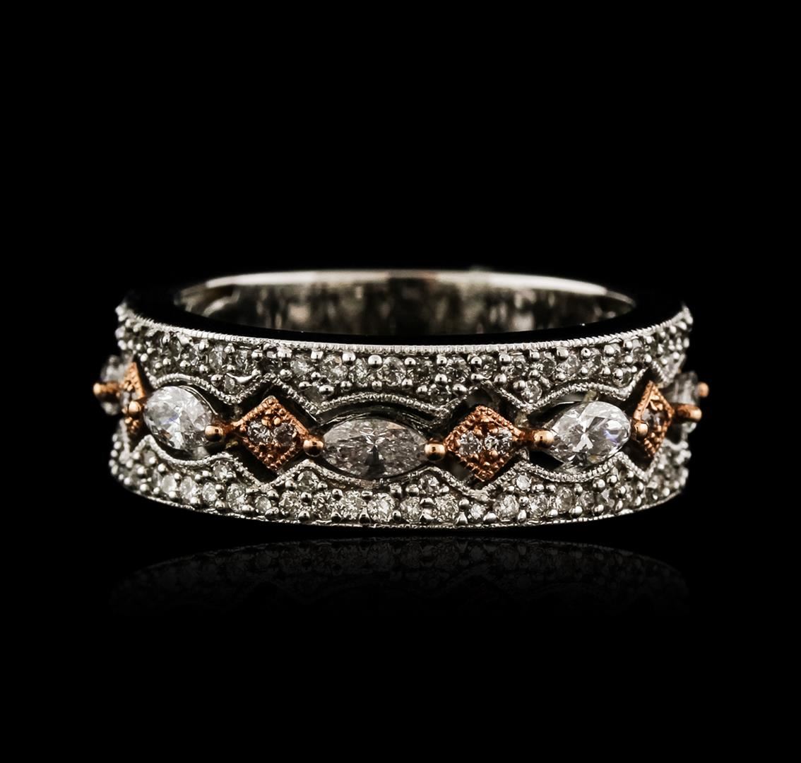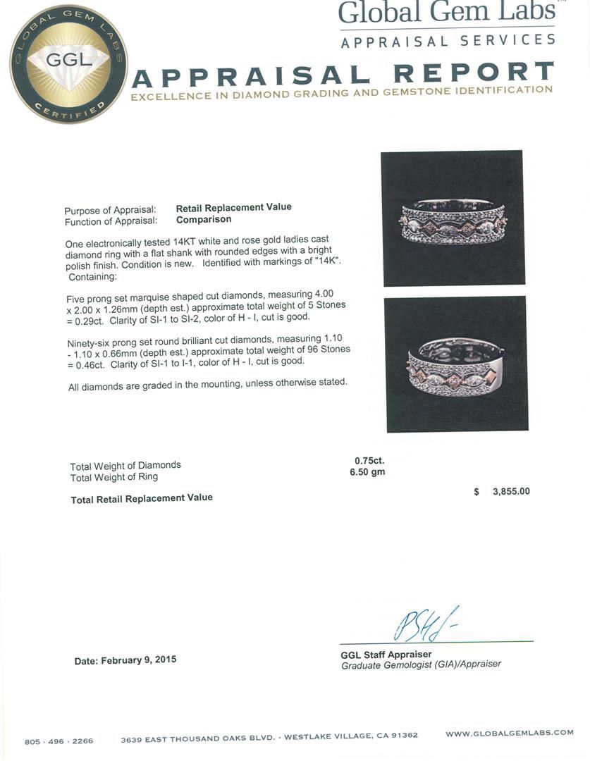 One electronically tested 14KT white and rose gold ladies cast diamond ring with a flat shank with rounded edges with a bright polish finish. Identified with markings of "14K". Condition is new. Containing: Five prong set marquise shaped cut diamonds, measuring 4.00 x 2.00 x 1.26mm (depth est.) approximate total weight of 5 Stones = 0.29ct. Clarity: SI-1 to SI-2. Color: H - I, Cut is Good. Ninety-Six prong set round brilliant cut diamonds, measuring 1.10 - 1.10 x 0.66mm (depth est.) approximate total weight of 96 Stones = 0.46ct. Clarity: SI-1 to I-1. Color: H - I, Cut is Good. All diamonds are graded in the mounting, unless otherwise stated. Total Weight of Diamonds 0.75ct. Total Weight of Ring 6.50 grams. GGL Appraised at $3,855.00.
