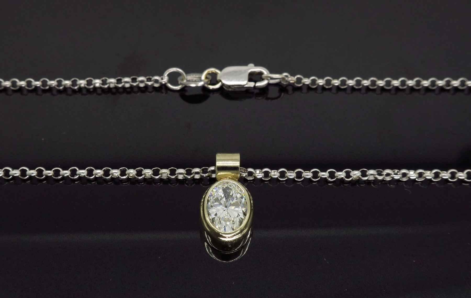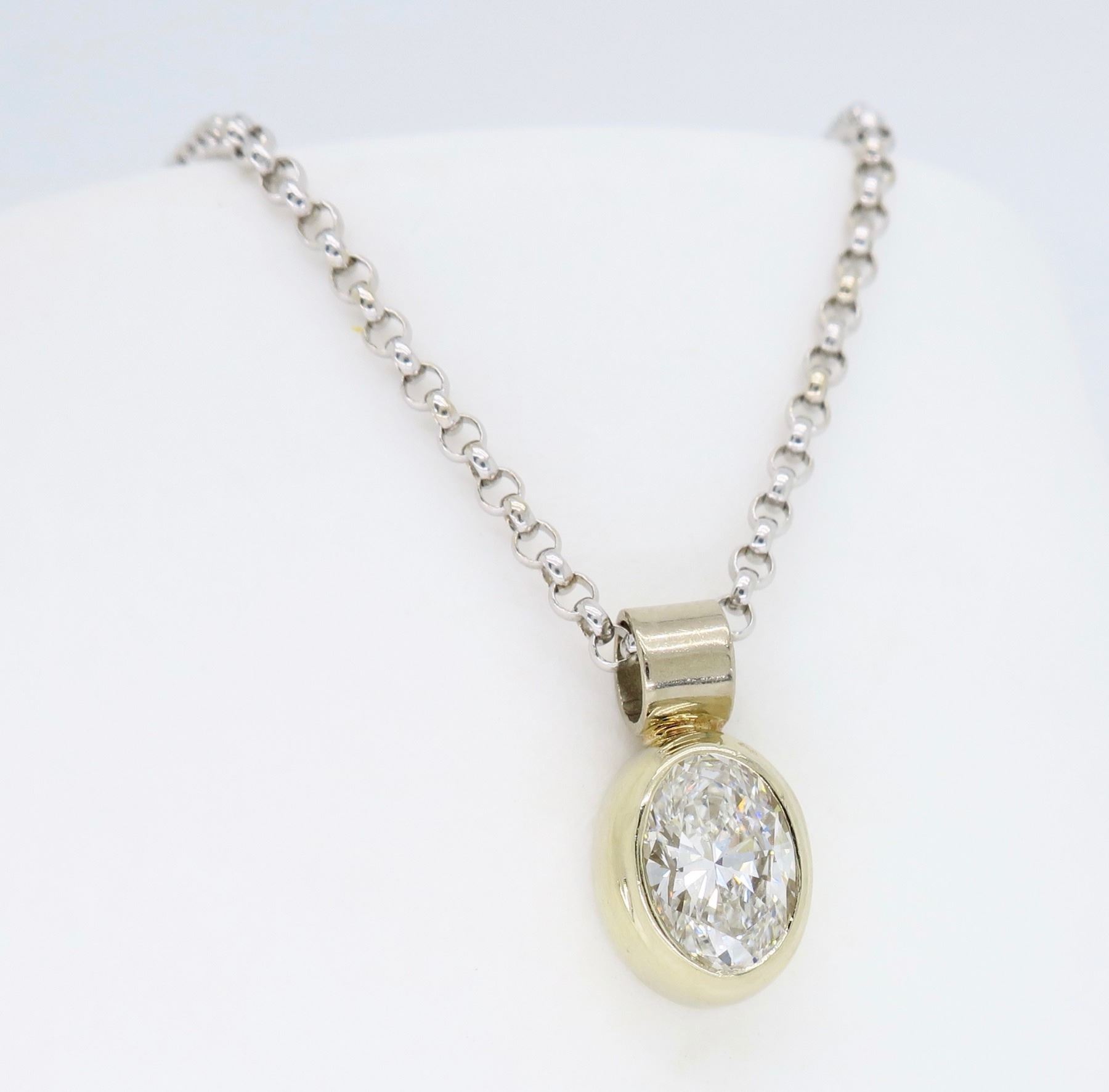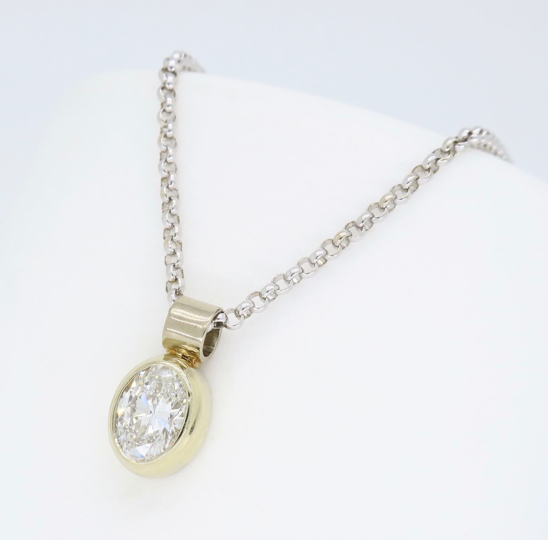 One 14KT Two Tone Gold 0.77ct Diamond Pendant with Chain. (1) Oval Diamond with a total weight of 0.77cts with a color of I and clarity of VS-2. Total weight of this pendant is 5.2 grams. Total length of this chain is 18 inches.