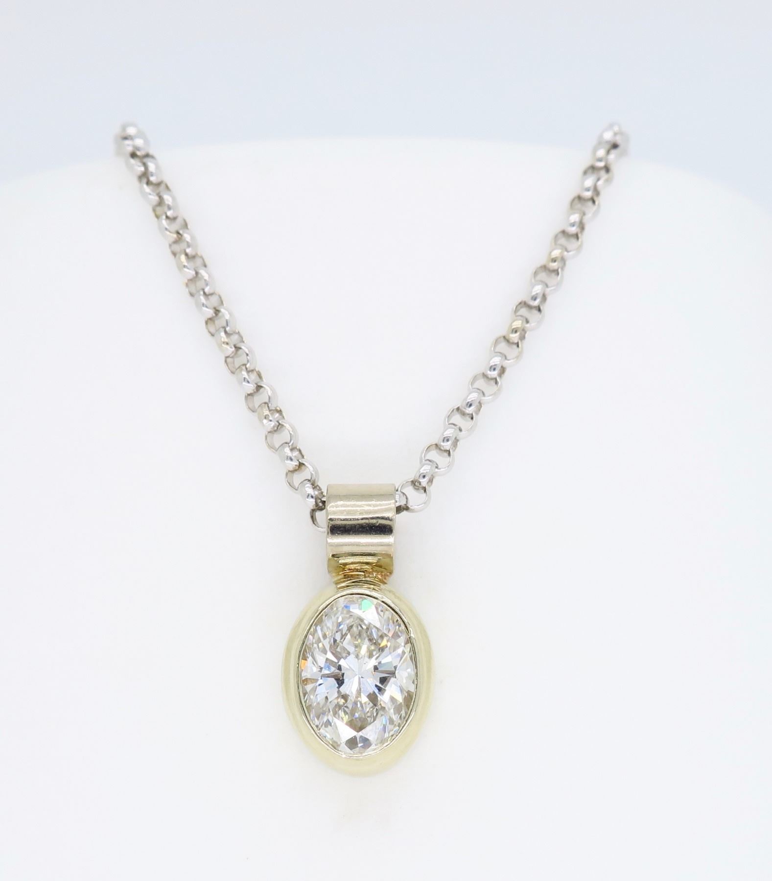 One 14KT Two Tone Gold 0.77ct Diamond Pendant with Chain. (1) Oval Diamond with a total weight of 0.77cts with a color of I and clarity of VS-2. Total weight of this pendant is 5.2 grams. Total length of this chain is 18 inches.