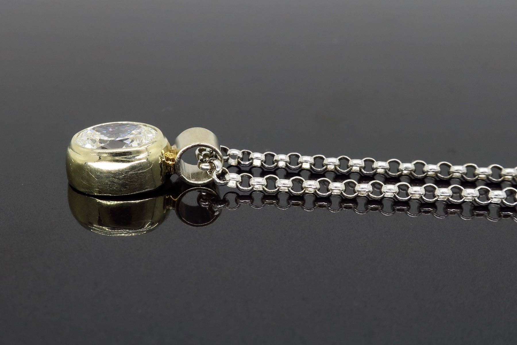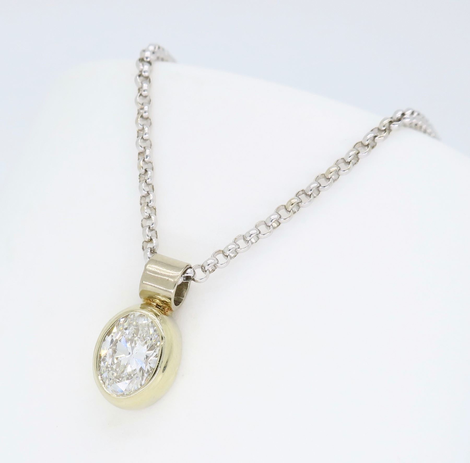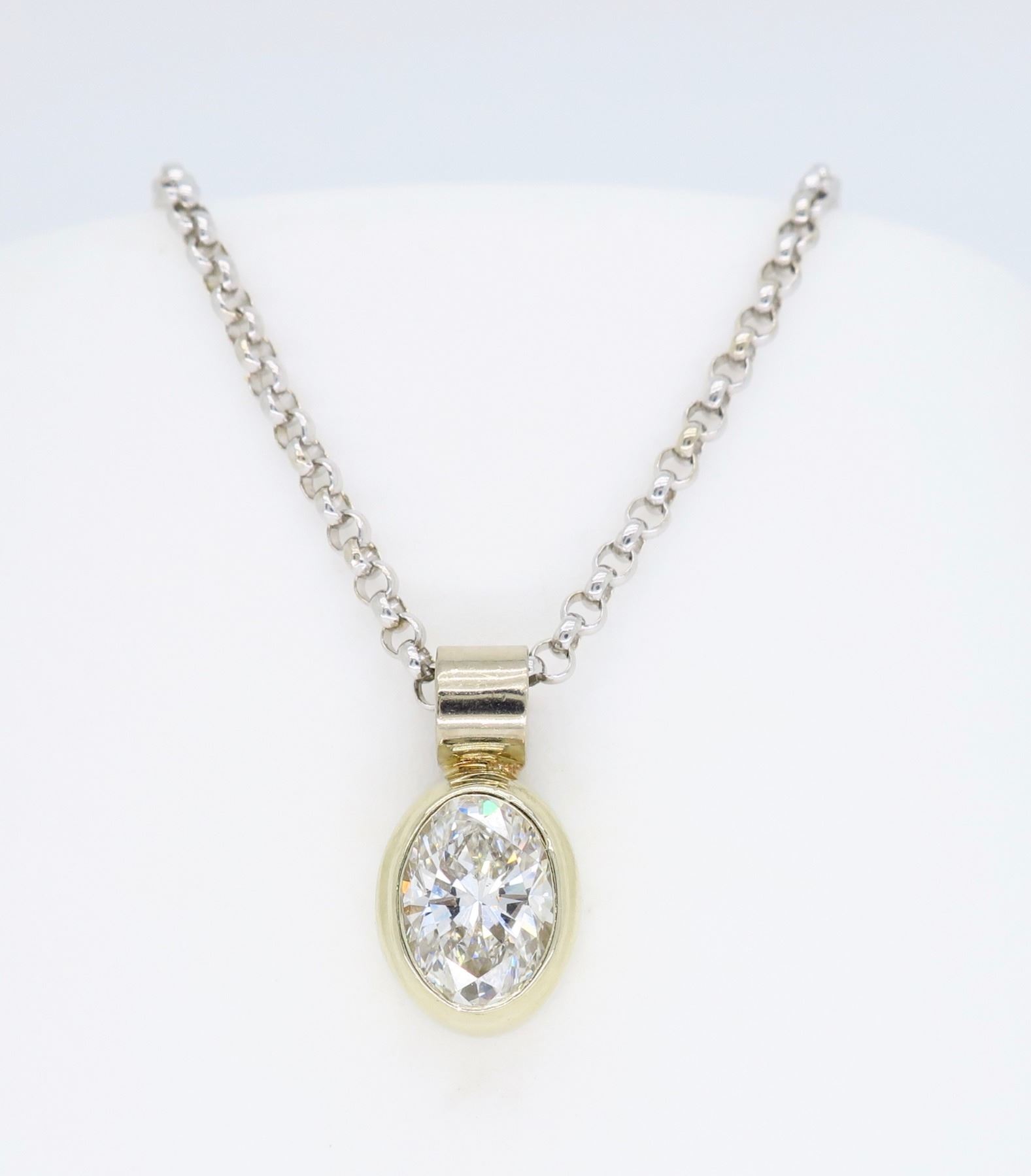 One 14KT Two Tone Gold 0.77ct Diamond Pendant with Chain. (1) Oval Diamond with a total weight of 0.77cts with a color of I and clarity of VS-2. Total weight of this pendant is 5.2 grams. Total length of this chain is 18 inches.