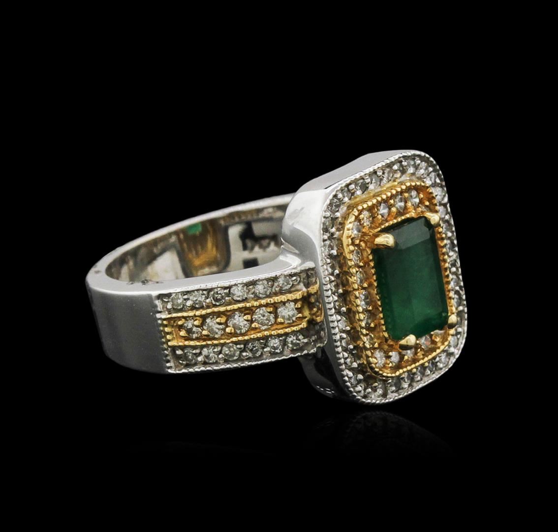 One electronically tested 14KT white and yellow gold ladies cast emerald and diamond ring with a flat shank with a bright polish finish. Identified with markings of "14K". Condition is new. Containing: One prong set emerald standard step cut natural emerald, measuring 7.00 x 5.00 x 3.25mm, approximate weight of 0.84ct., clarity is heavily included, type III, medium dark, moderately strong, green color, (GIA G 6/4), cut is good. Eighty-Eight prong set round brilliant cut diamonds, measuring 1.20 - 1.20 x 0.72mm (depth est.) approximate total weight of 88 Stones = 0.55ct. Clarity of SI-2 to I-2, Color of I - J, Cut is Good. All diamonds and colored gemstones are graded in the mounting, unless otherwise stated. Colored gemstones are presumed to have been subjected to commonly used enhancement processes. Total Weight of Colored Stones 0.84ct. Total Weight of Diamonds 0.55ct. Total Weight of Ring 8.70 grams. GGL Appraised at $3,590.00.