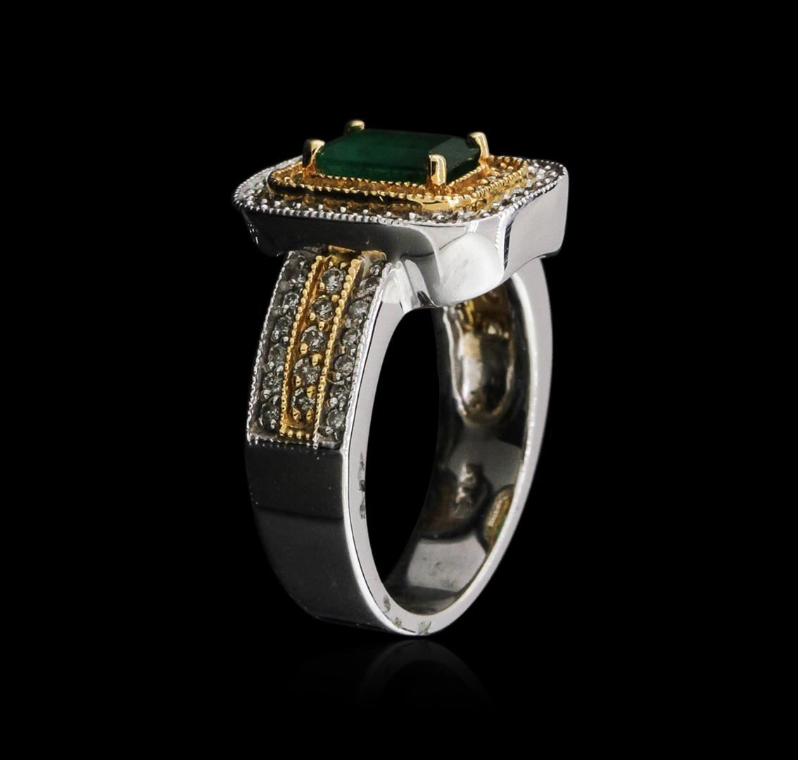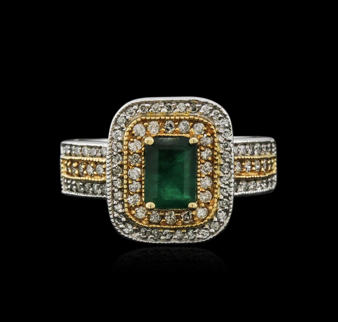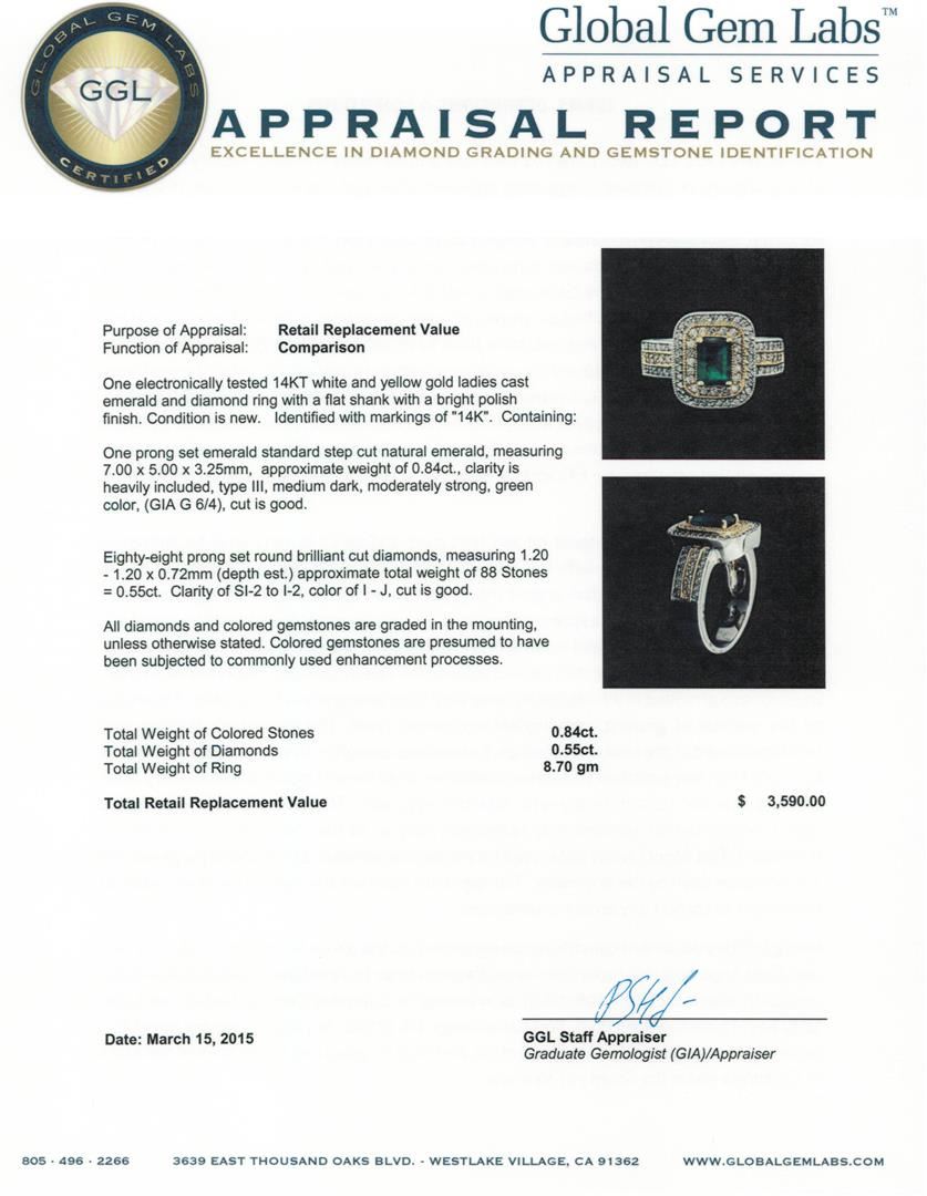 One electronically tested 14KT white and yellow gold ladies cast emerald and diamond ring with a flat shank with a bright polish finish. Identified with markings of "14K". Condition is new. Containing: One prong set emerald standard step cut natural emerald, measuring 7.00 x 5.00 x 3.25mm, approximate weight of 0.84ct., clarity is heavily included, type III, medium dark, moderately strong, green color, (GIA G 6/4), cut is good. Eighty-Eight prong set round brilliant cut diamonds, measuring 1.20 - 1.20 x 0.72mm (depth est.) approximate total weight of 88 Stones = 0.55ct. Clarity of SI-2 to I-2, Color of I - J, Cut is Good. All diamonds and colored gemstones are graded in the mounting, unless otherwise stated. Colored gemstones are presumed to have been subjected to commonly used enhancement processes. Total Weight of Colored Stones 0.84ct. Total Weight of Diamonds 0.55ct. Total Weight of Ring 8.70 grams. GGL Appraised at $3,590.00.