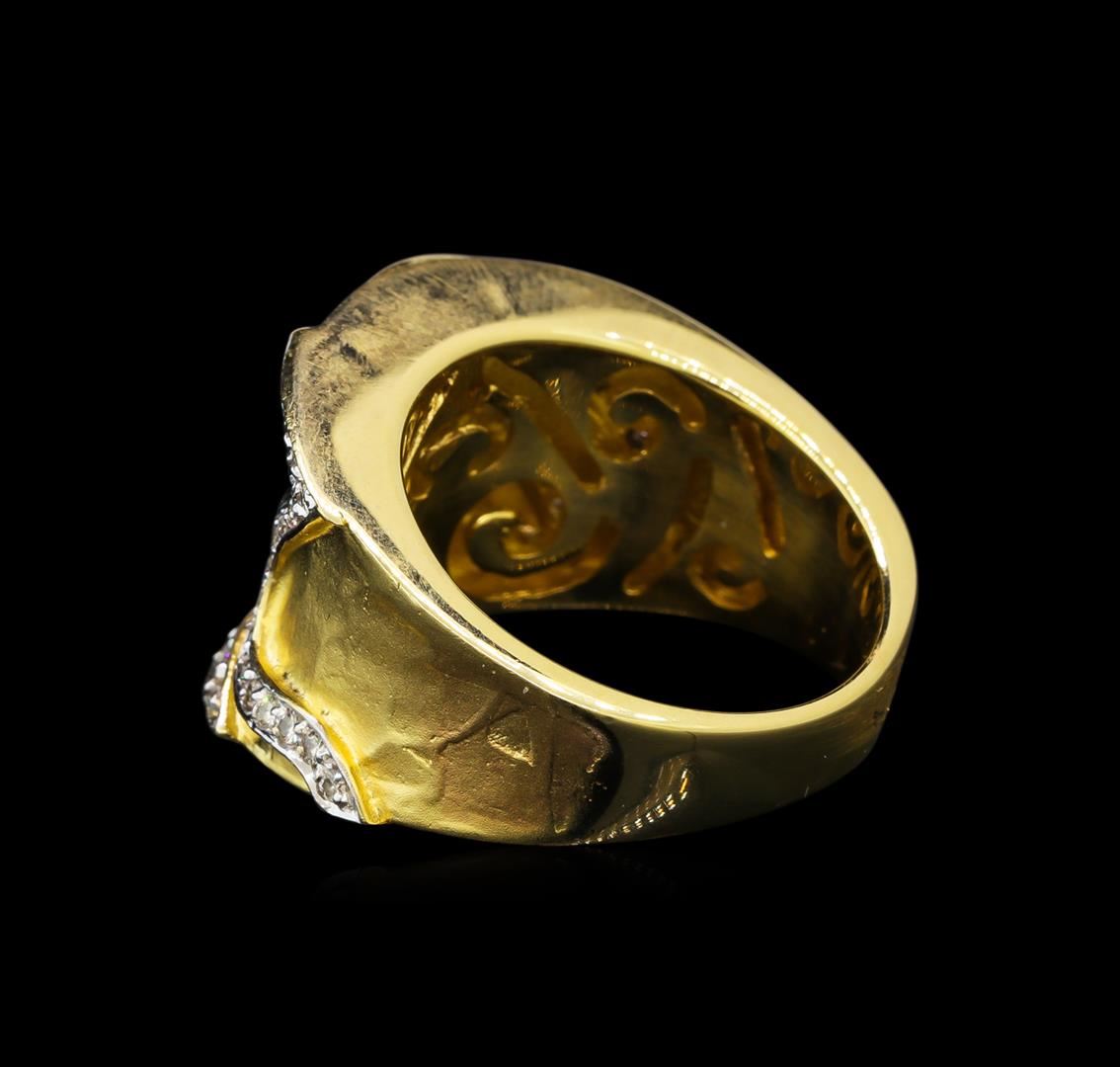 One electronically tested 14KT yellow and white gold ladies cast diamond ring with a bright and satin finish. The ring features a curvature with three stylized diamond ribbons, terminating in a four and one-half millimeter wide band. Identified with markings of "14K". Condition is good. Containing: Sixty-Two prong set round brilliant cut diamonds, measuring 1.60 - 1.40 x 0.90mm (depth est.) approximate total weight of 62 Stones = 0.86ct. Graded in the setting. Clarity: VS-1 to SI-1. Color: H - J. Total Weight of Diamonds 0.86ct. Total Weight of Ring 14.98 grams. AIG Appraised at $5,570.00.